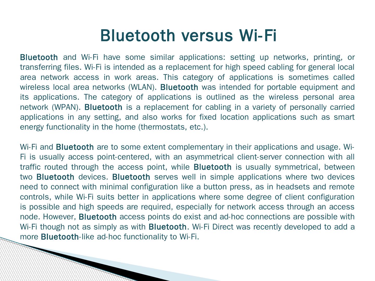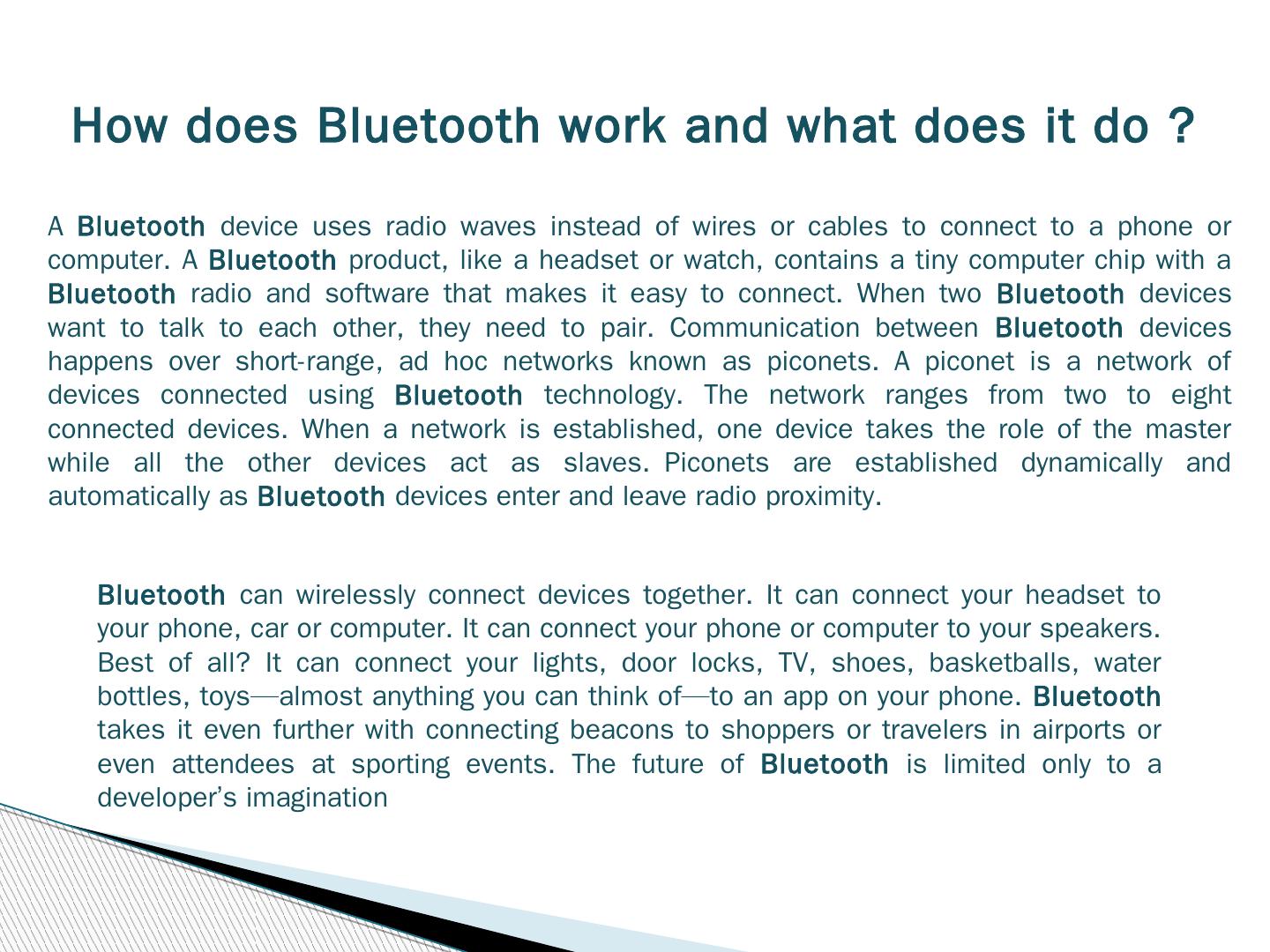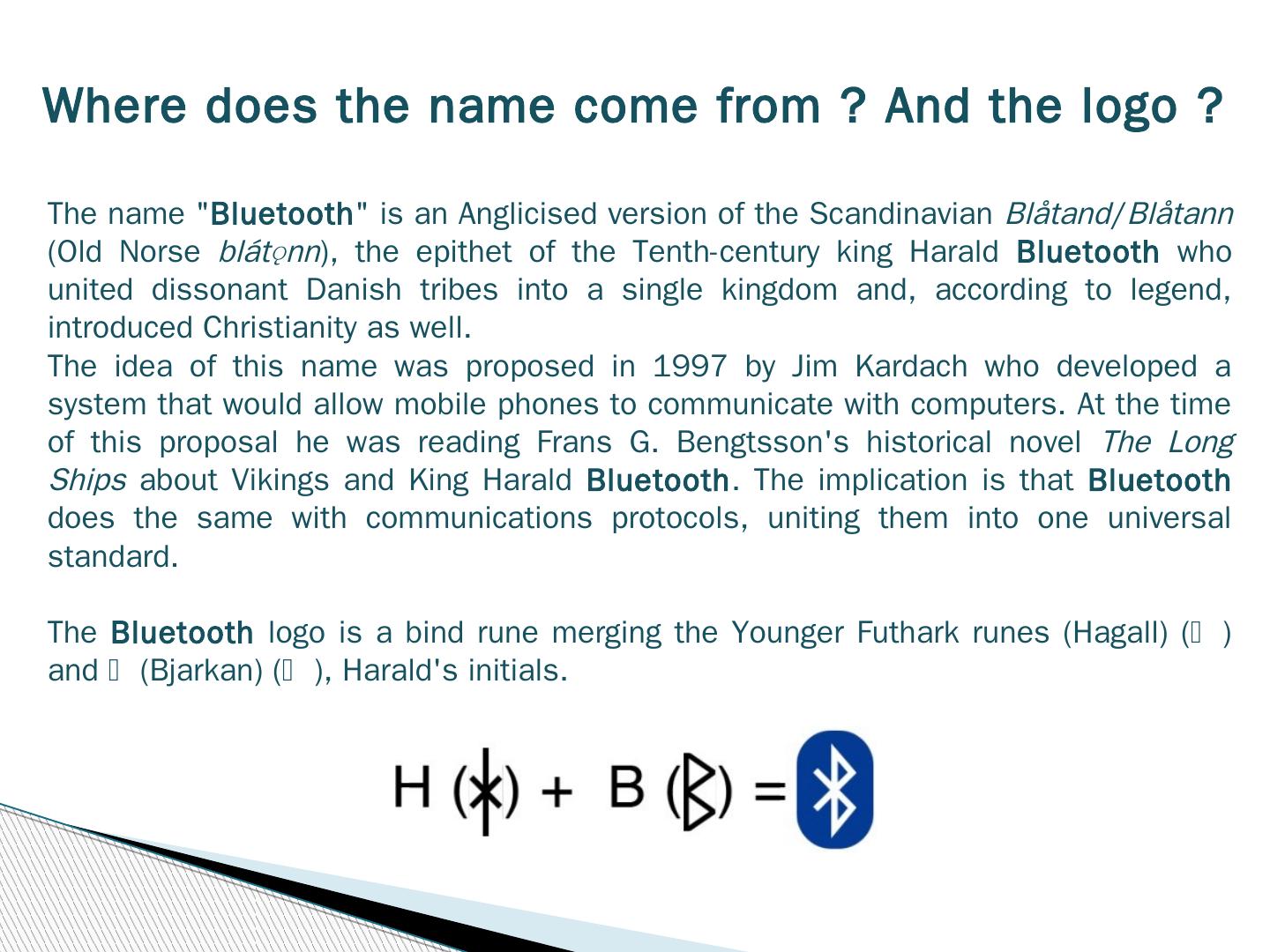 The development of the "short-link" radio technology, later named Bluetooth, ... Bluetooth protocols simplify the discovery and setup of services between devices.