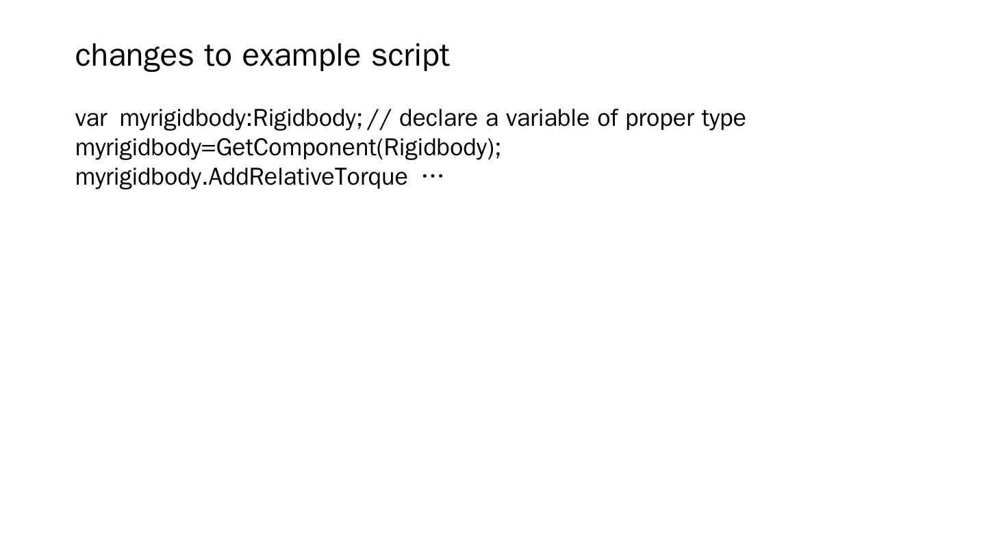 Building a Game with Unity3D. changes to example script. var myrigidbody:Rigidbody; // declare a variable of proper type