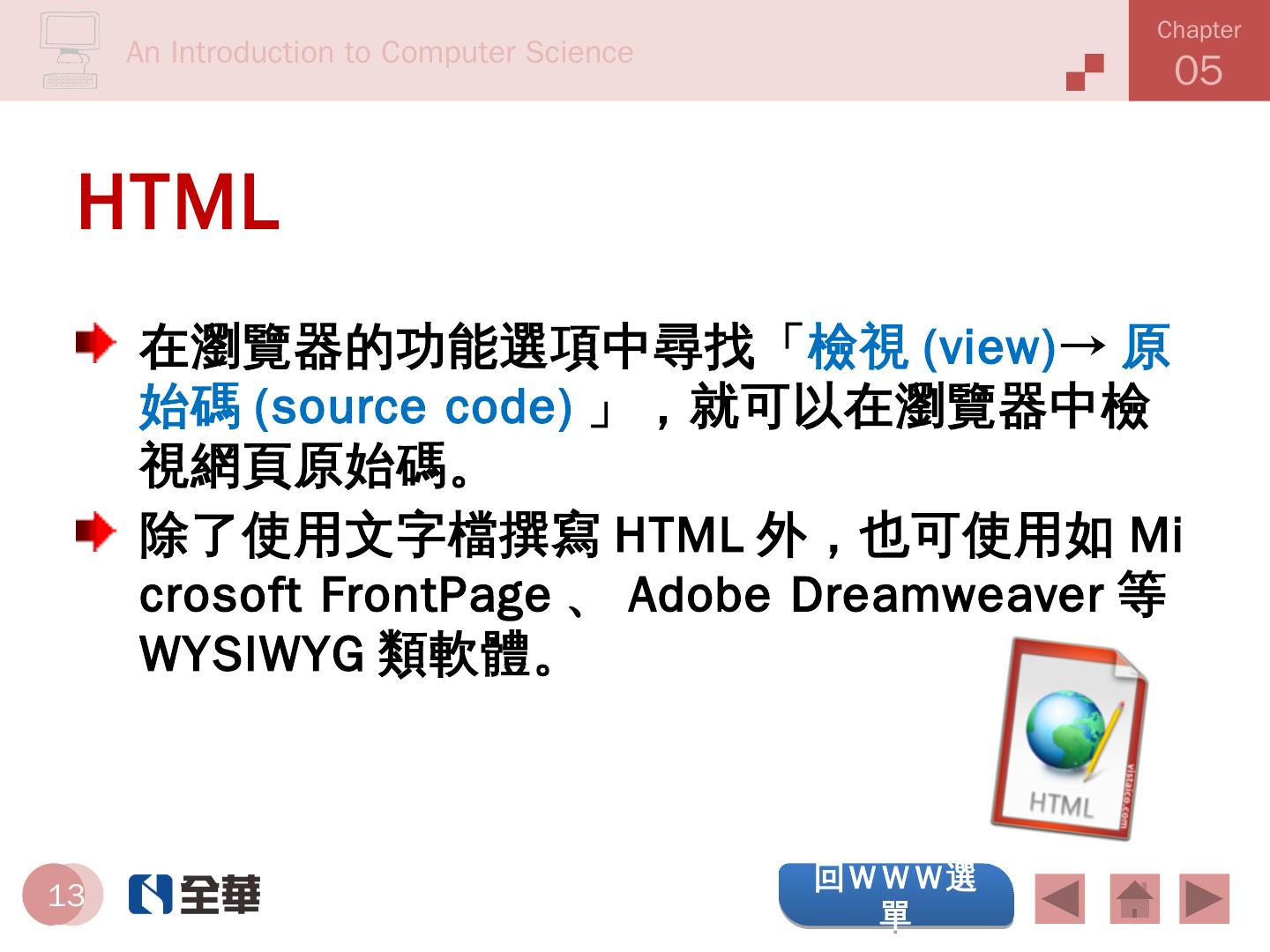 雙絞銅線使用兩條包覆好的銅線相互交叉捲起(可減少電磁場干擾),通常將多條雙絞 ..... HTML雖不屬於WYSIWYG,但也不需要經過編譯,只需使用瀏覽器就可以看到 ...