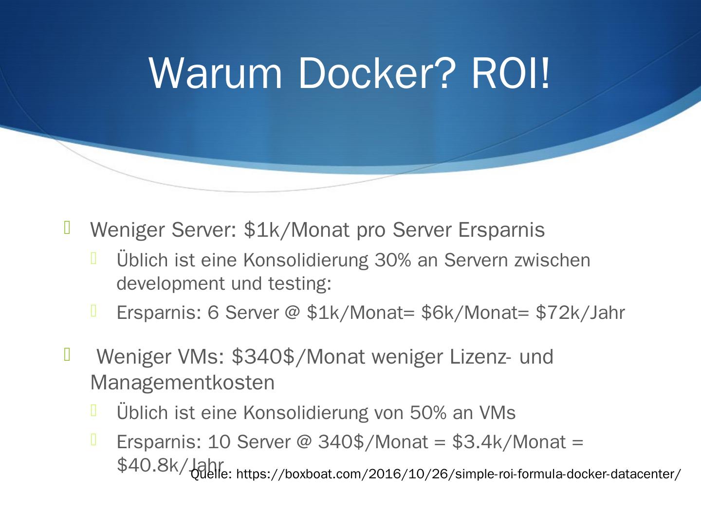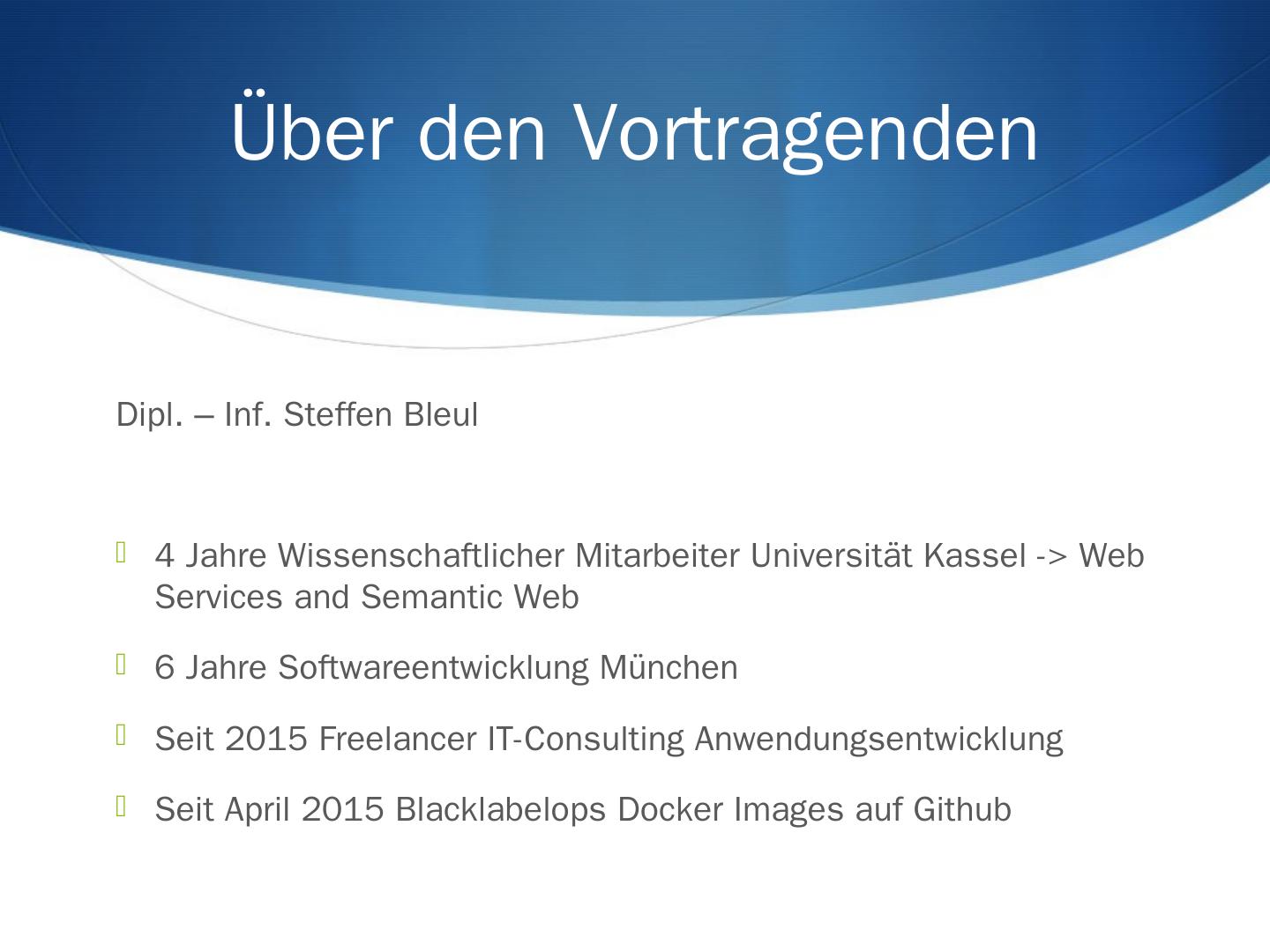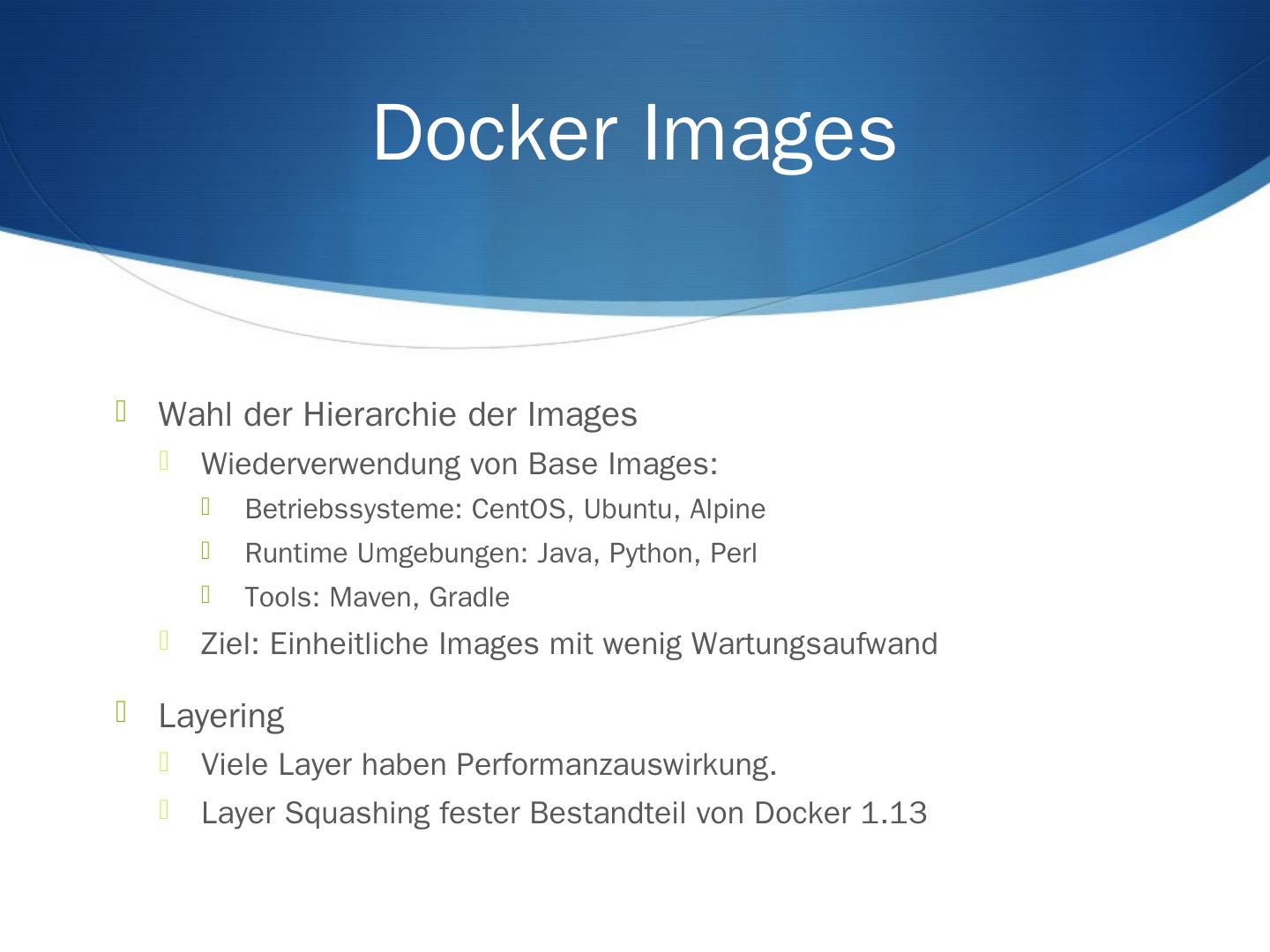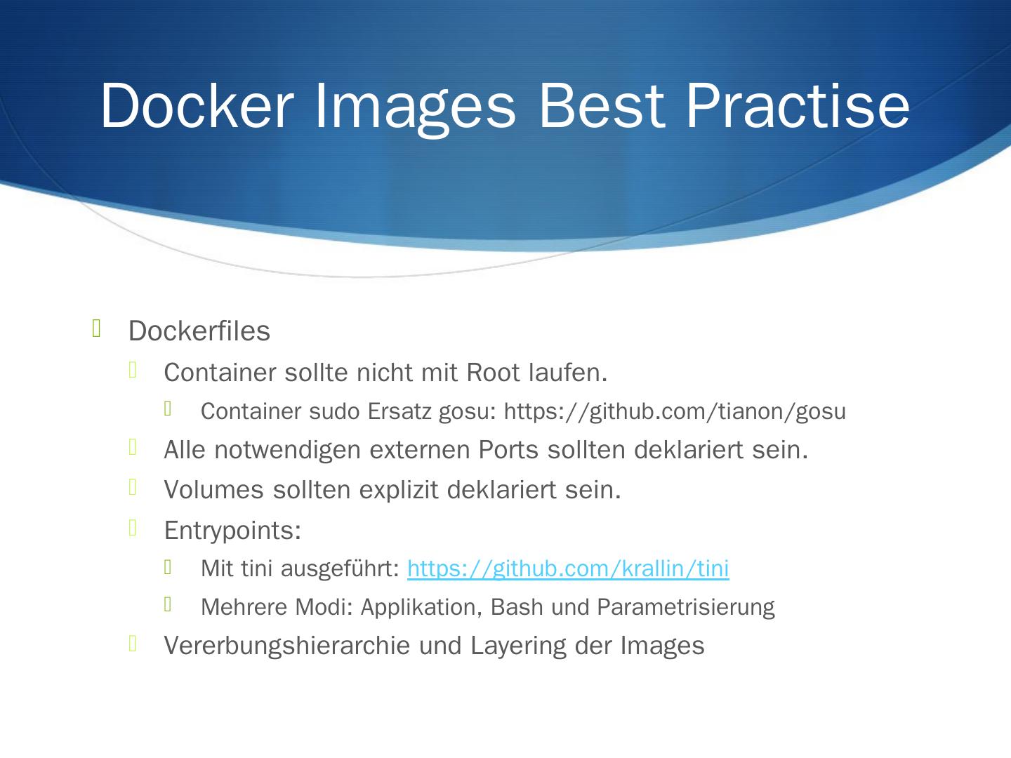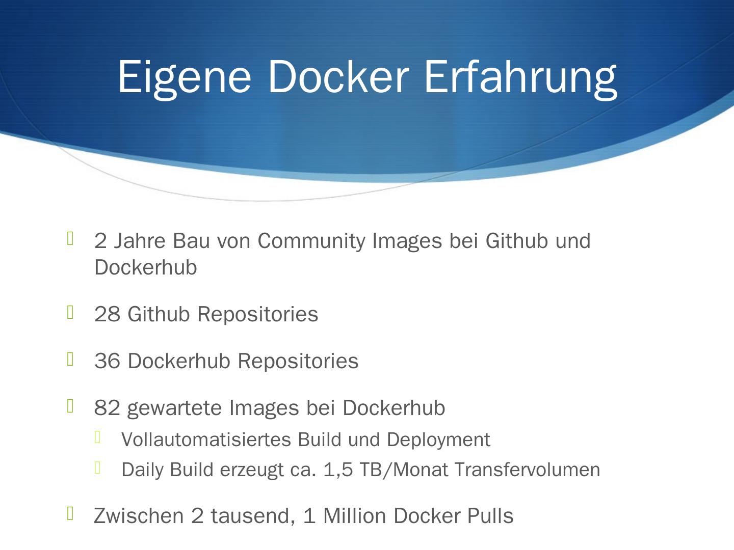Eigene Docker Erfahrung. 2 Jahre Bau von Community Images bei Github und Dockerhub; 28 Github Repositories; 36 Dockerhub Repositories; 82 gewartete ...