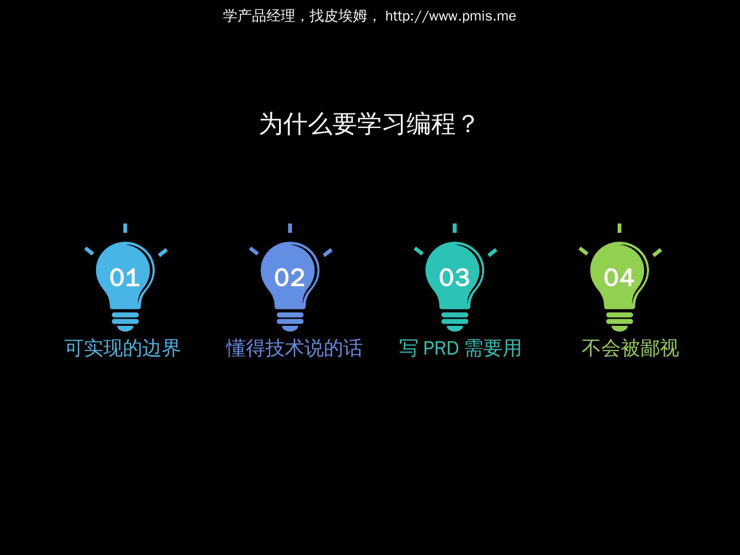 编程. 学产品经理,找皮埃姆,http://www.pmis.me. 为什么要学习编程? 01 ... 底层语言,集成电路,可以开发操作系统,windows系统,万能语言,教学使用. 02. Java.