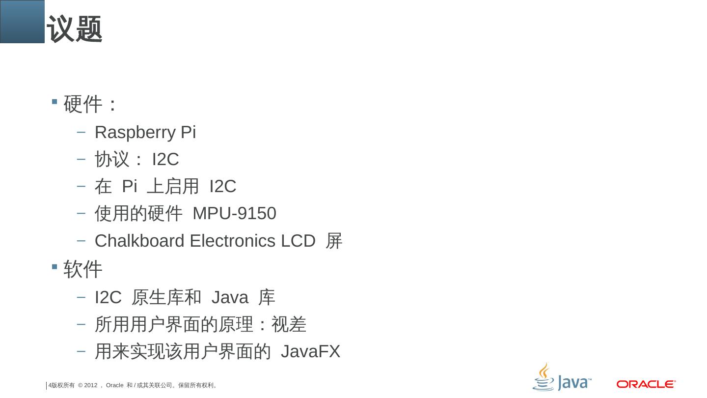 介绍基于Raspberry Pi硬件,启用I2C协议,使用新的硬件MPU-9150和LCD屏,并用I2C原声库和Java库以及JavaFX来完成用软件控制和户界面的绘制。典型的利用树莓派这个便宜的硬件和Java一起来完成比较有意思的硬件控制功能。