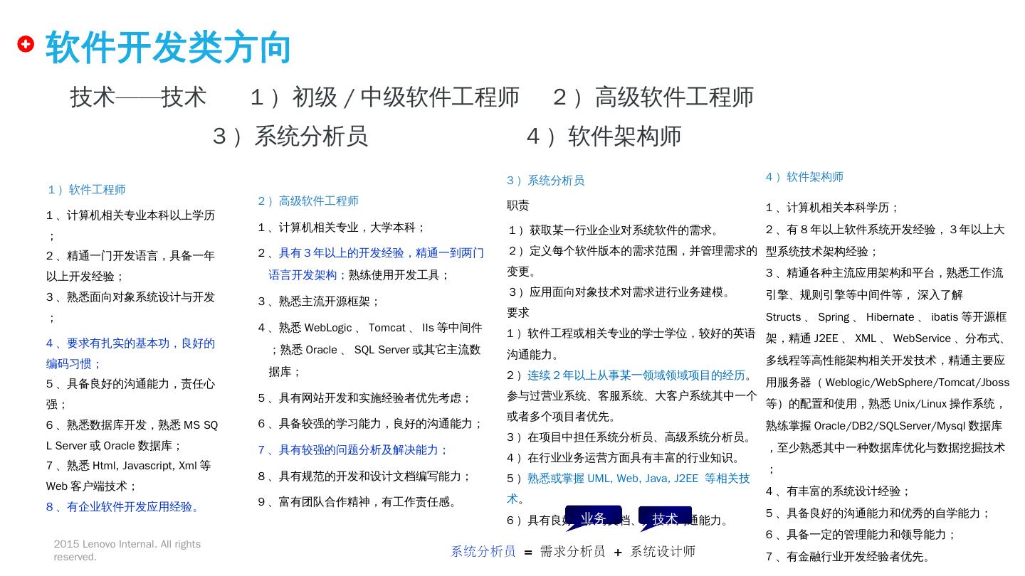 ... 的总称,是在信息科学的基本原理和方法的指导下扩展人类信息处理功能的技术. ... 总体设计、详细设计 软件架构师、 系统分析员 ... 系统测试 软件测试、项目实施 ... 的配置和使用,熟悉Unix/Linux操作系统,熟练掌握Oracle/DB2/SQLServer/Mysql ...