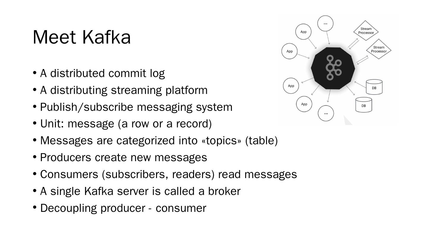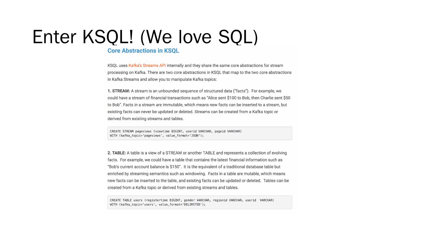 KSQL - the Streaming SQL Engine for Apache Kafka ... message bus only; Storm,Spark,Flink,Samza - stream processing systems; Kafka version 0.10.0 includes ...