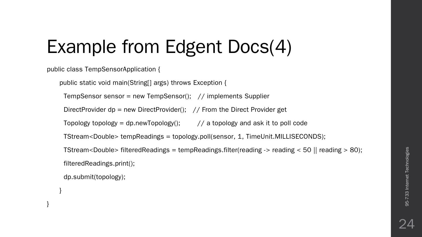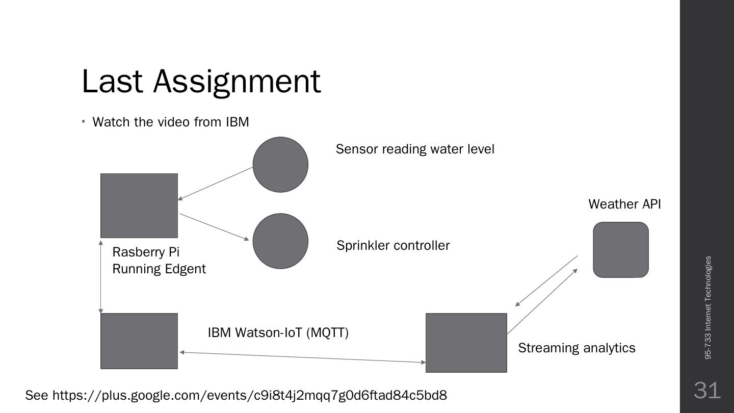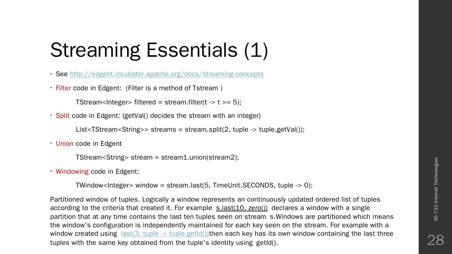 IBM's Node Red, Apache Spark Streaming and Apache Flink are typically found ... An MQTT broker; Apache Kafka; IBM Watson IoT (wraps MQTT on the cloud) ...