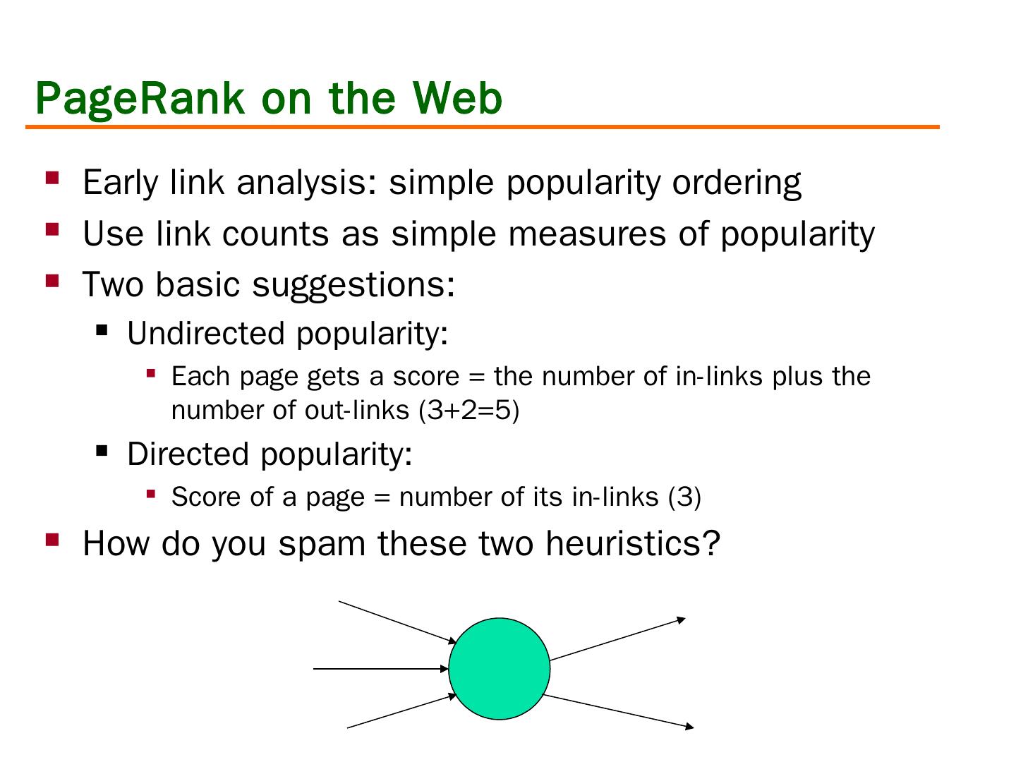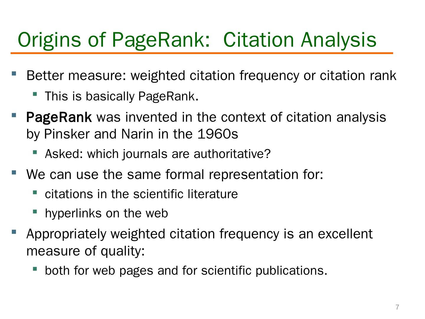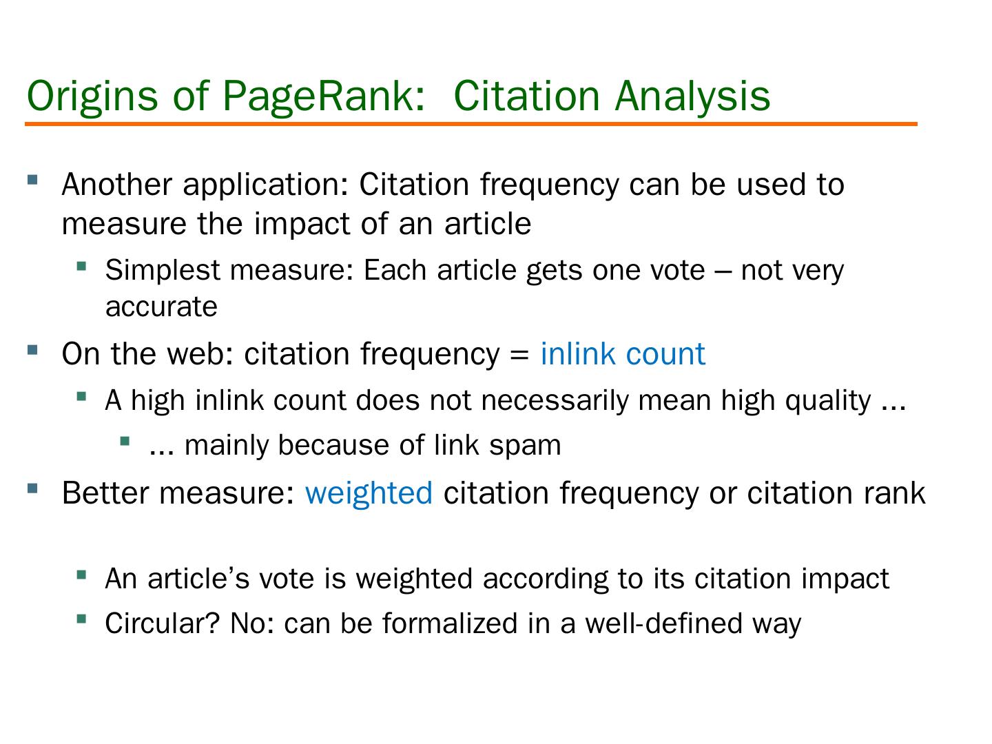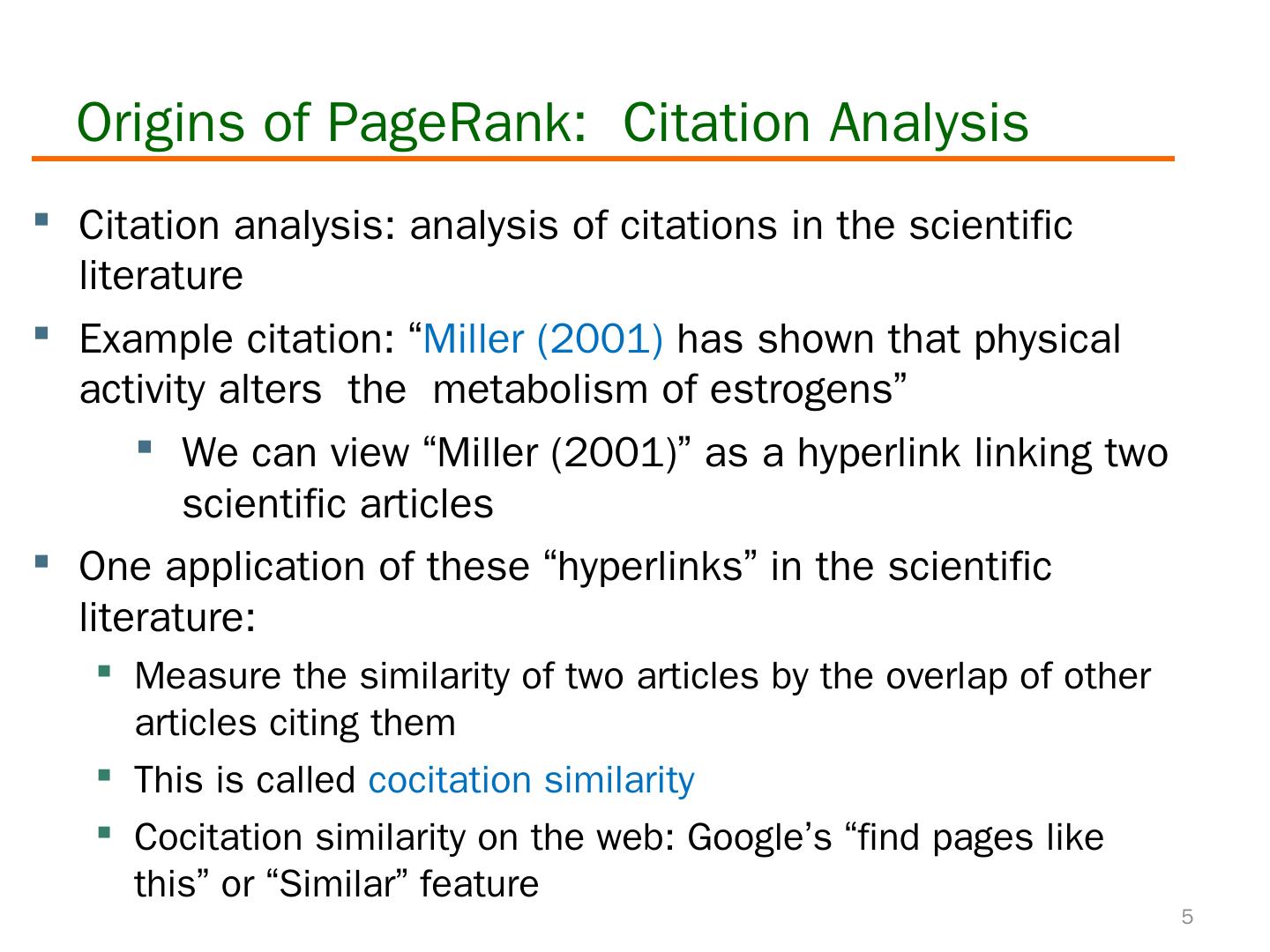 Origins of PageRank: Citation Analysis. Citation analysis: analysis of citations in the scientific literature; Example citation: “Miller (2001) has shown that physical ...