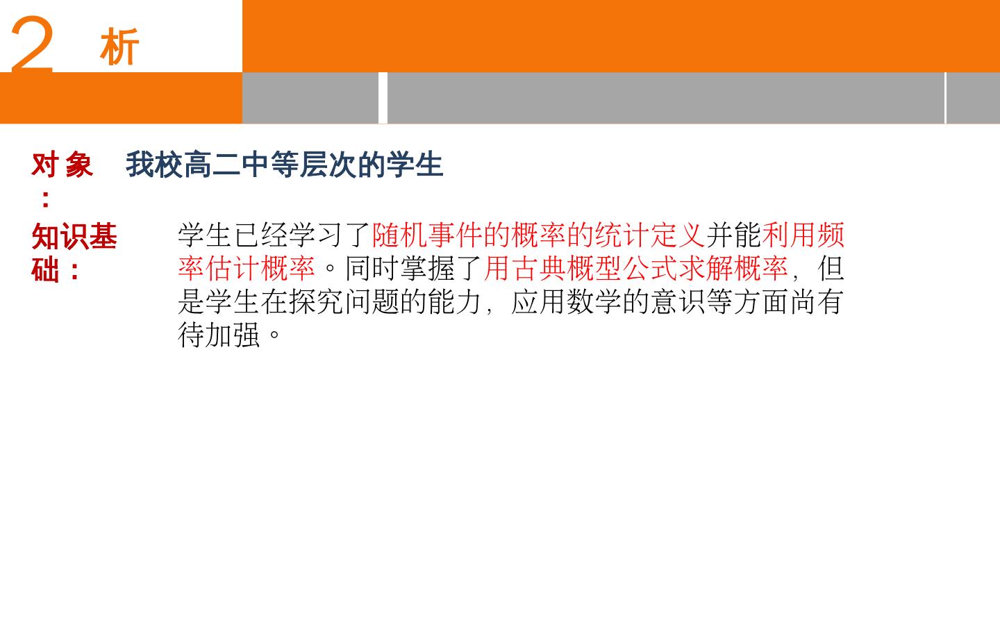 随机事件的概率的统计定义. 并能. 利用频率估计概率 。同时掌握了. 用古典概型公式求解概率. ,但是学生在探究问题的能力,应用数学的意识等方面尚有待加强 。