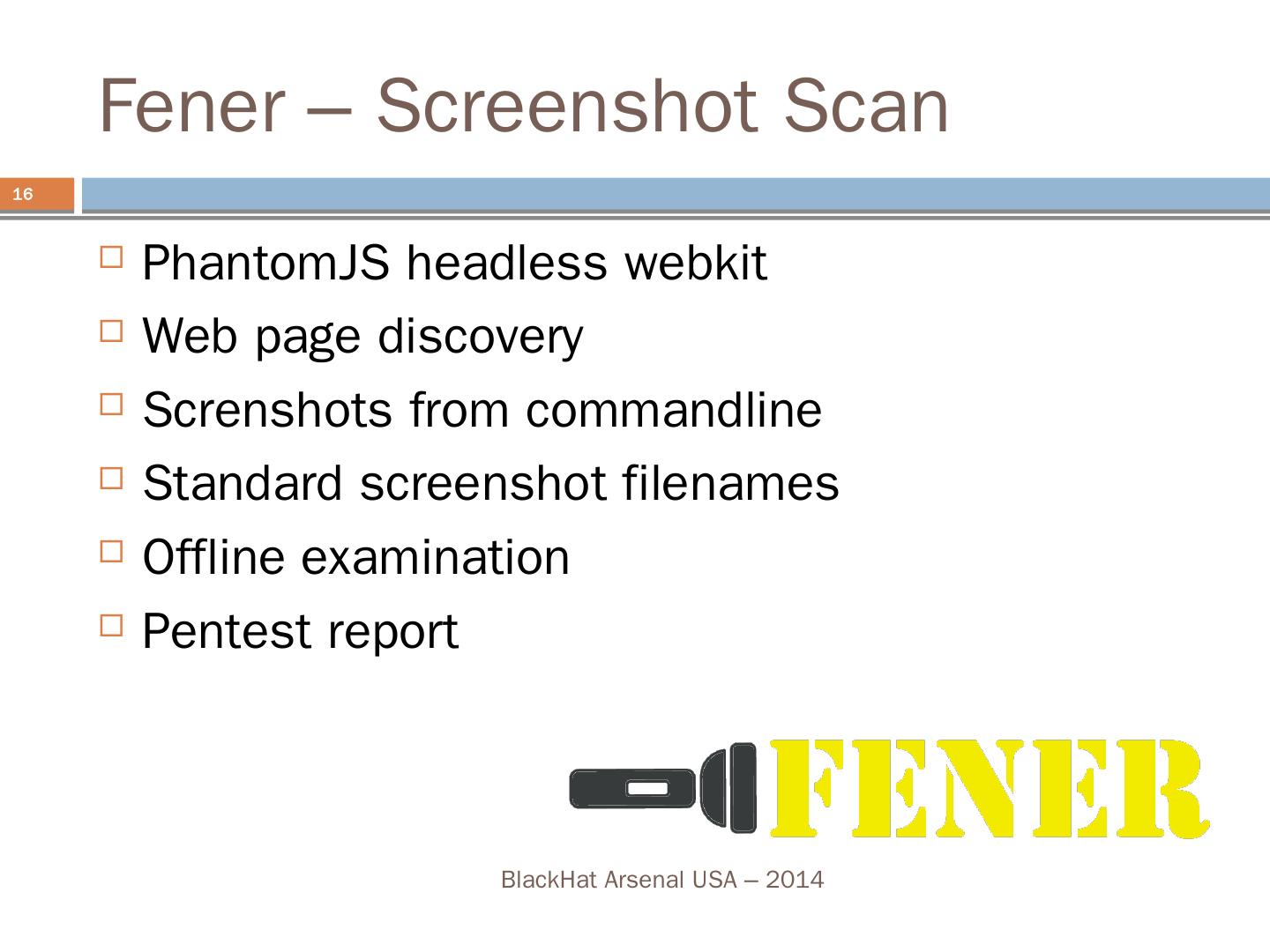 PhantomJS headless webkit; Web page discovery; Screnshots from commandline; Standard screenshot filenames; Offline examination; Pentest report. BlackHat ...
