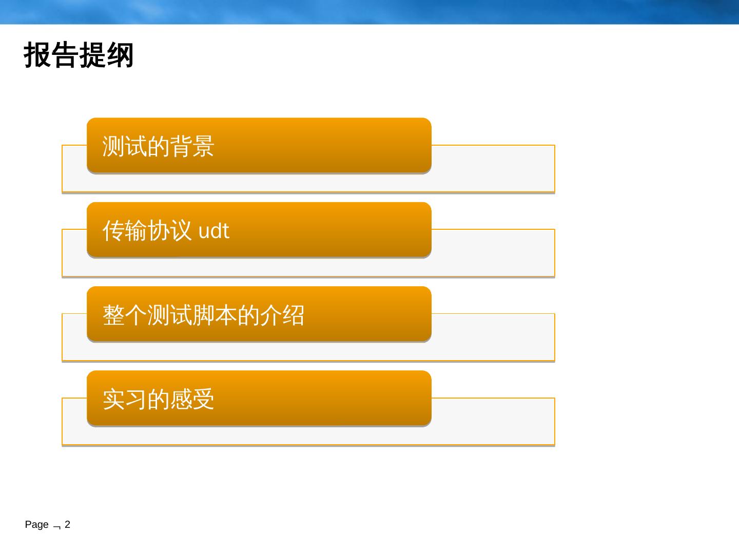2 .报告提纲 测试的背景 传输协议 udt 整个测试脚本的介绍 实习的感受 Page 2