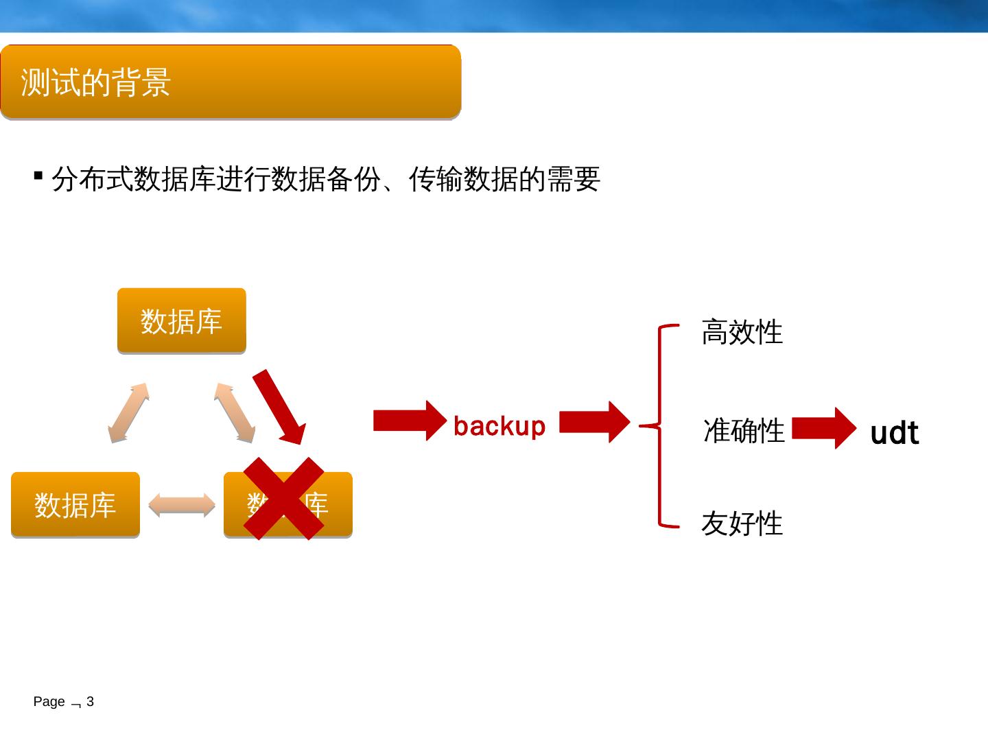3 .测试的背景 分布式数据库进行数据备份、传输数据的需要 数据库 高效性 backup 准确性 udt 数据库 数据库 友好性 Page 3