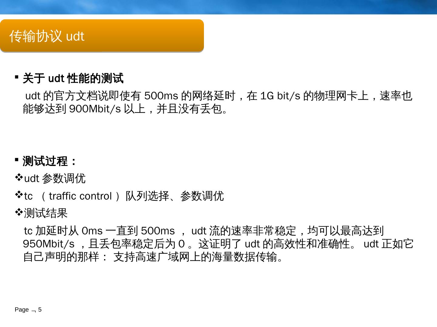5 .传输协议 udt 关于 udt 性能的测试 udt 的官方文档说即使有 500ms 的网络延时,在 1G bit/s 的物理网卡上,速率也 能够达到 900Mbit/s 以上,并且没有丢包。 测试过程: udt 参数调优 tc ( traffic control )队列选择、参数调优 测试结果 tc 加延时从 0ms 一直到 500ms , udt 流的速率非常稳定,均可以最高达到 950Mbit/s ,且丢包率稳定后为 0 。这证明了 udt 的高效性和准确性。 udt 正如它 自己声明的那样: 支持高速广域网上的海量数据传输。 Page 5