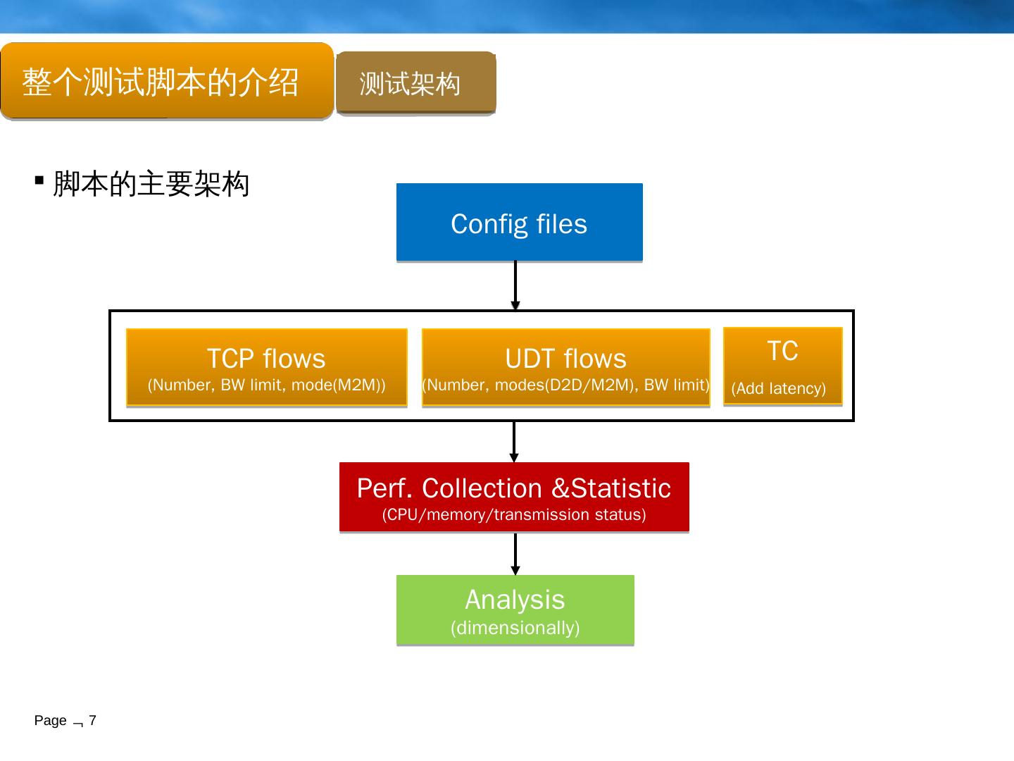6 .整个测试脚本的介绍 测试架构 内核工具 tc 进行网络延时模拟 启动 tcp 流工具、监视网络状态工具 测试关注的参数 数据结果分析 虚拟网卡 bonding 的影响 Page 6