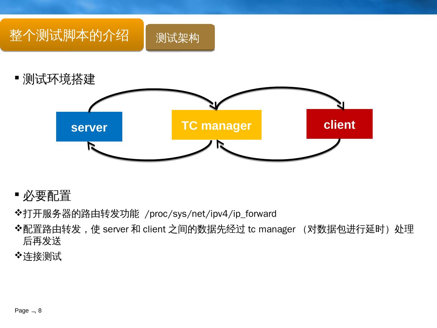 8 .整个测试脚本的介绍 测试架构 测试环境搭建 server TC manager client 必要配置 打开服务器的路由转发功能 /proc/sys/net/ipv4/ip_forward 配置路由转发,使 server 和 client 之间的数据先经过 tc manager (对数据包进行延时)处理 后再发送 连接测试 Page 8