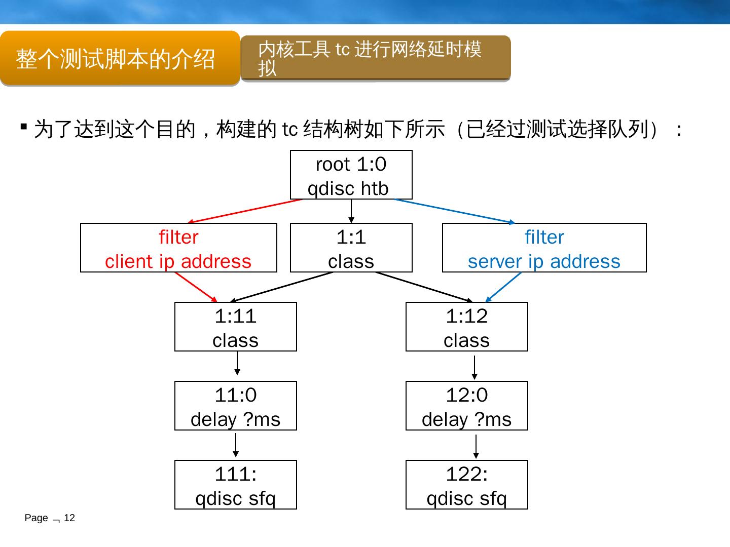 11 . 内核工具 tc 进行网络延时模 整个测试脚本的介绍 拟 我们的测试中,主要是利用 tc 进行对 server 与 client 上通过的数据包进行网络延 时,来模拟实际的网域网传输情况,功能如下图所示: server TC 延时manager 100ms client 为了测试的正确性,如果数据包不是从 server 发往 client (或从 client 发往 server ),则不会被 tc 过滤器过滤而进行延时操作。 Page 11