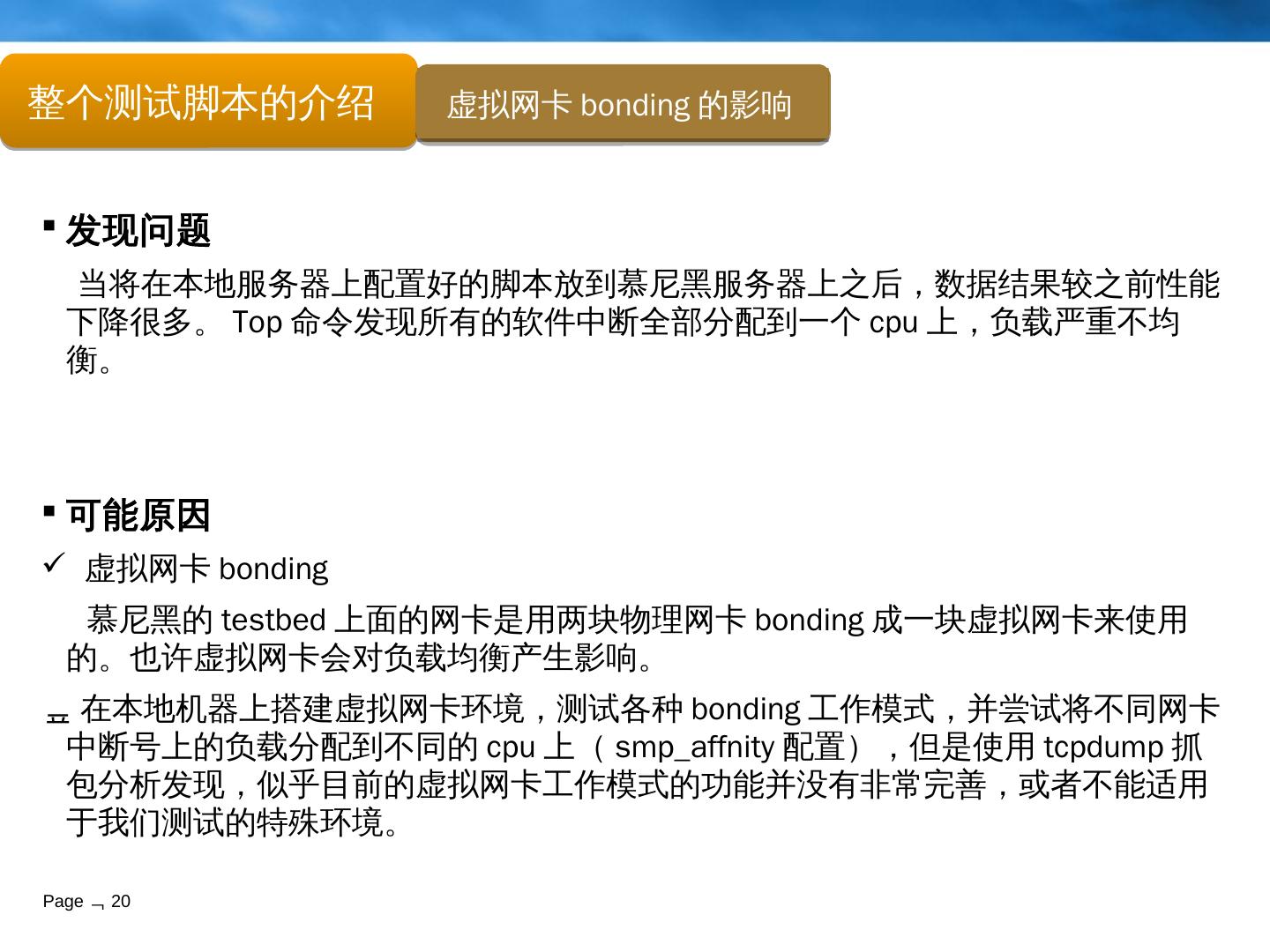 20 .整个测试脚本的介绍 虚拟网卡 bonding 的影响 发现问题 当将在本地服务器上配置好的脚本放到慕尼黑服务器上之后,数据结果较之前性能 下降很多。 Top 命令发现所有的软件中断全部分配到一个 cpu 上,负载严重不均 衡。 可能原因 虚拟网卡 bonding 慕尼黑的 testbed 上面的网卡是用两块物理网卡 bonding 成一块虚拟网卡来使用 的。也许虚拟网卡会对负载均衡产生影响。 在本地机器上搭建虚拟网卡环境,测试各种 bonding 工作模式,并尝试将不同网卡 中断号上的负载分配到不同的 cpu 上( smp_affnity 配置),但是使用 tcpdump 抓 包分析发现,似乎目前的虚拟网卡工作模式的功能并没有非常完善,或者不能适用 于我们测试的特殊环境。 Page 20