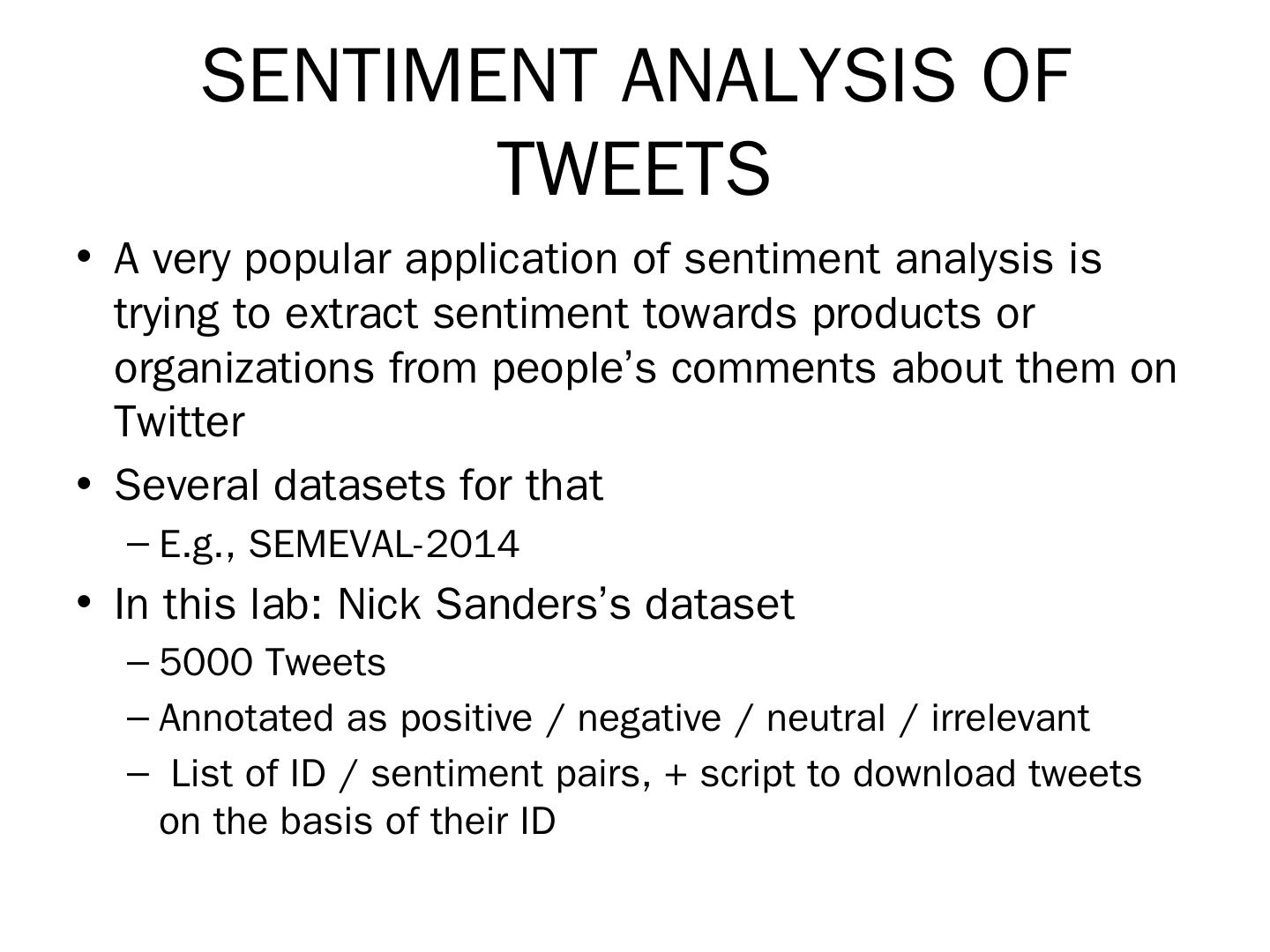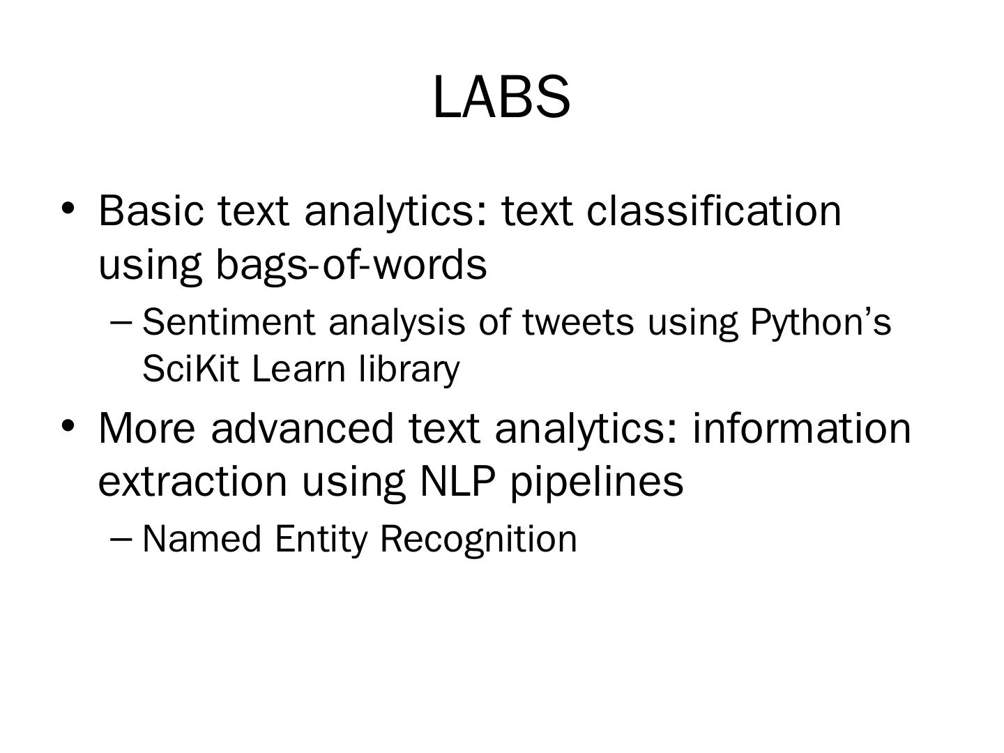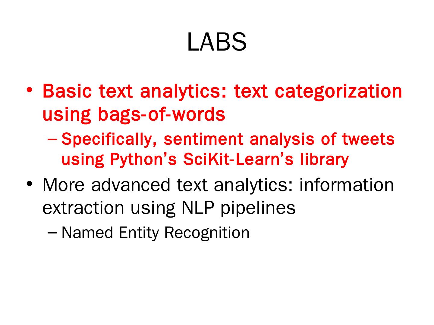 LABS. Basic text analytics: text classification using bags-of-words. Sentiment analysis of tweets using Python's SciKit Learn library. More advanced text analytics: ...