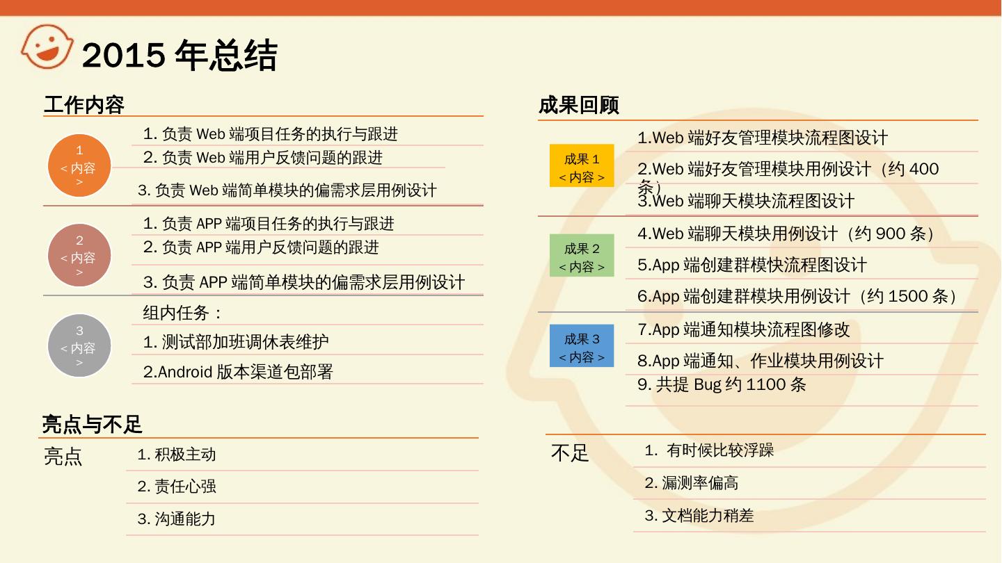 测试部 2015年终工作总结 姓名:杨婷婷. 2015年总结. 1.负责Web端项目任务的执行与跟进. 2.负责Web端用户反馈问题的跟进. 1.负责APP端项目任务的执行与跟进.