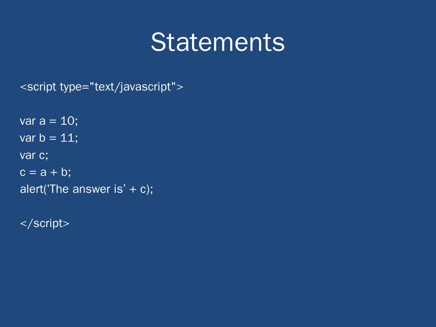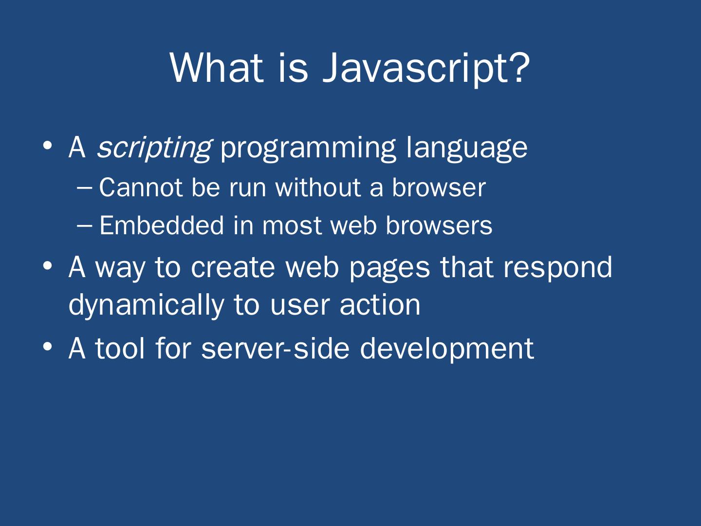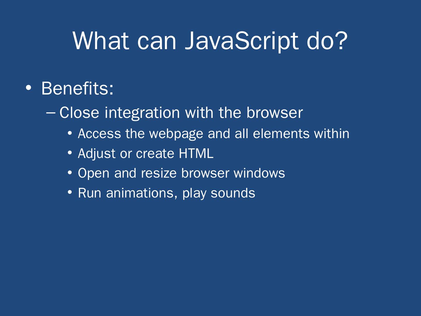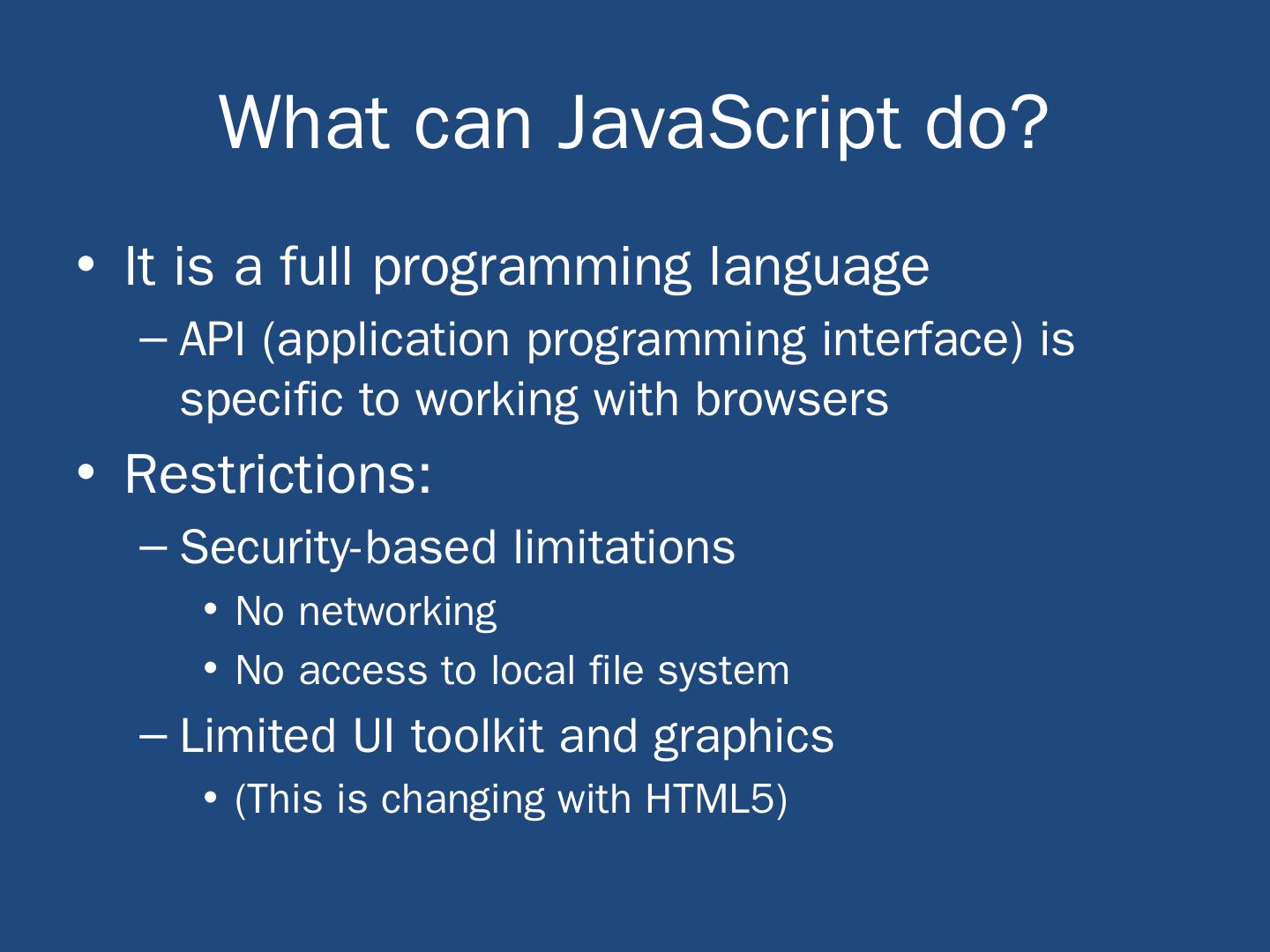Actually ECMAScript (ECMA-262). en.wikipedia.org/wiki/ECMAScript; Several variants (JScript, Action Script…) What can JavaScript do? It is a full programming ...