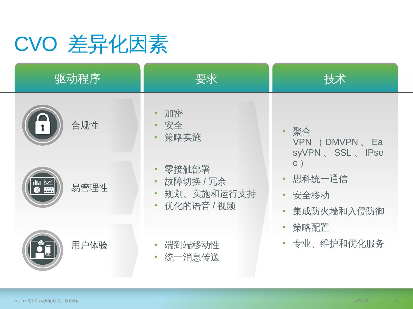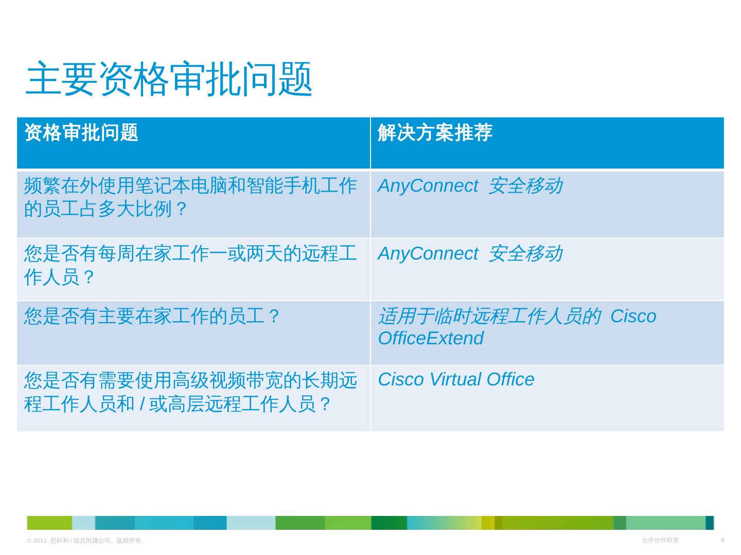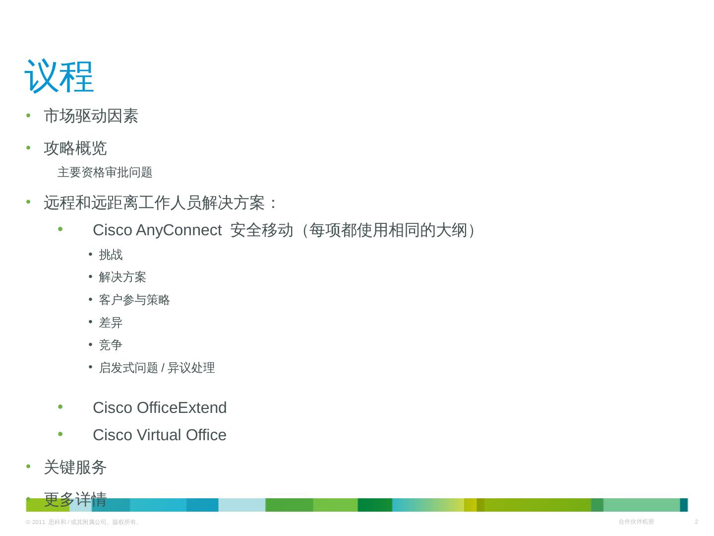 市场驱动因素; 攻略概览. 主要资格审批问题 ... 从多个设备连接; 可靠且安全的访问; 移动视频和语音要求. 移动性,智能手机, .... Windows、Mac 和Linux; Apple iOS 4.