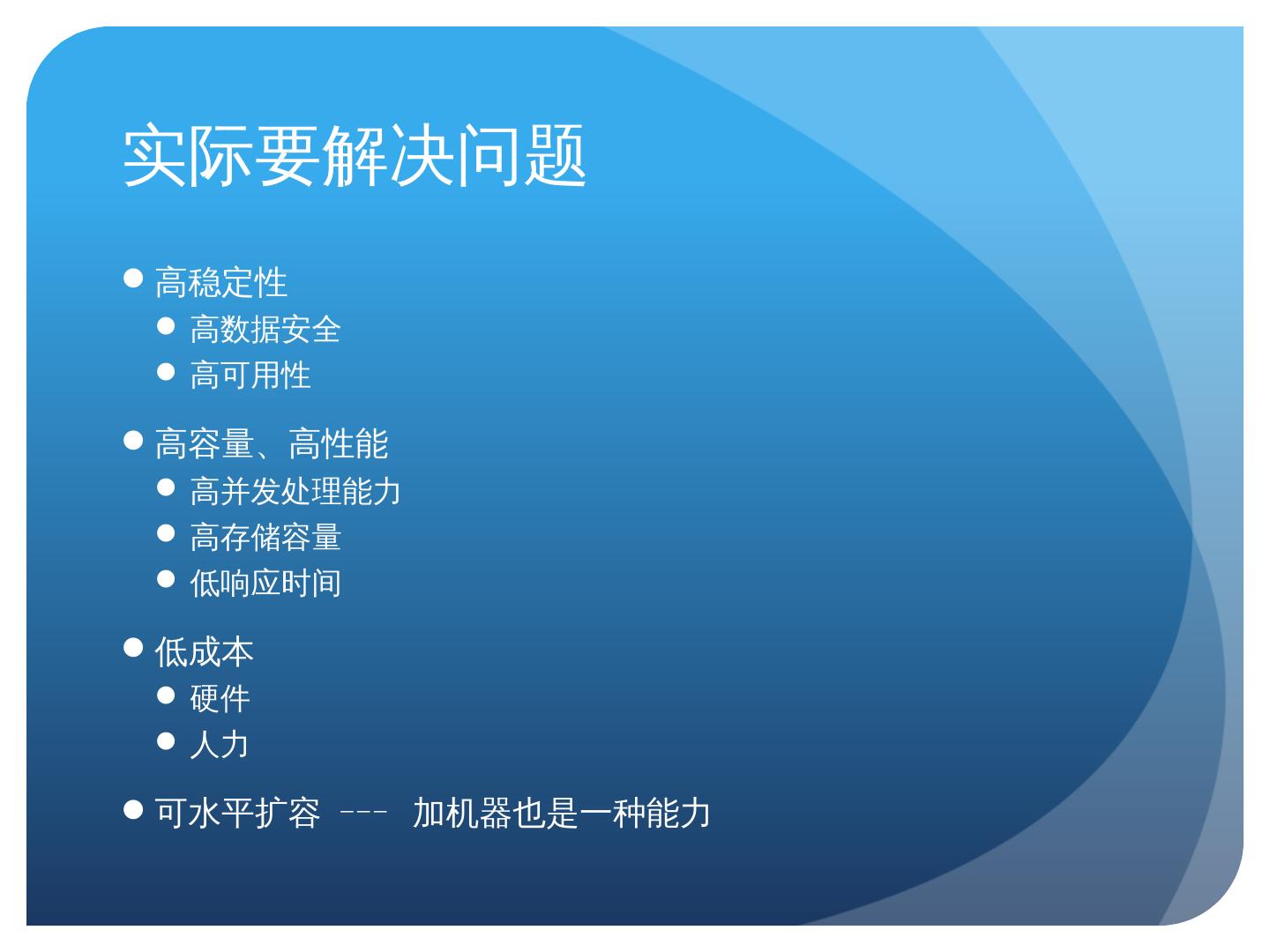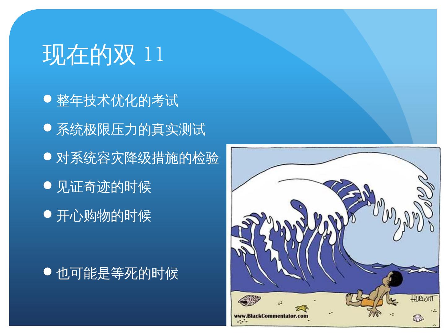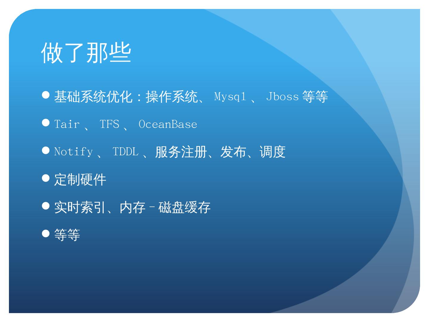 基础系统优化:操作系统、Mysql、Jboss等等; Tair、TFS、OceanBase; Notify、TDDL、服务注册、发布、调度; 定制硬件; 实时索引、内存-磁盘缓存; 等等. 技术历程.