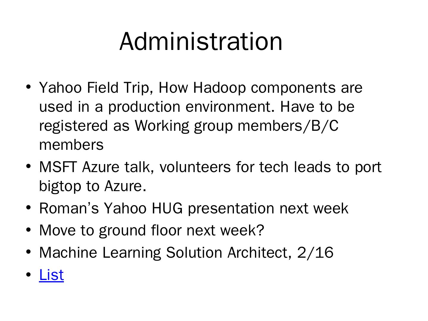 Apache Bigtop. Week 9 Integration Testing, M/R Coding. Administration. Yahoo Field Trip, How Hadoop components are used in a production environment.