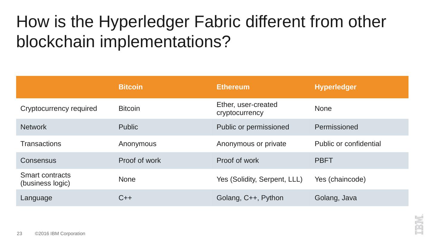 IBM is adopting Blockchain to a very broad range of business applications .... How is the Hyperledger Fabric different from other blockchain implementations?