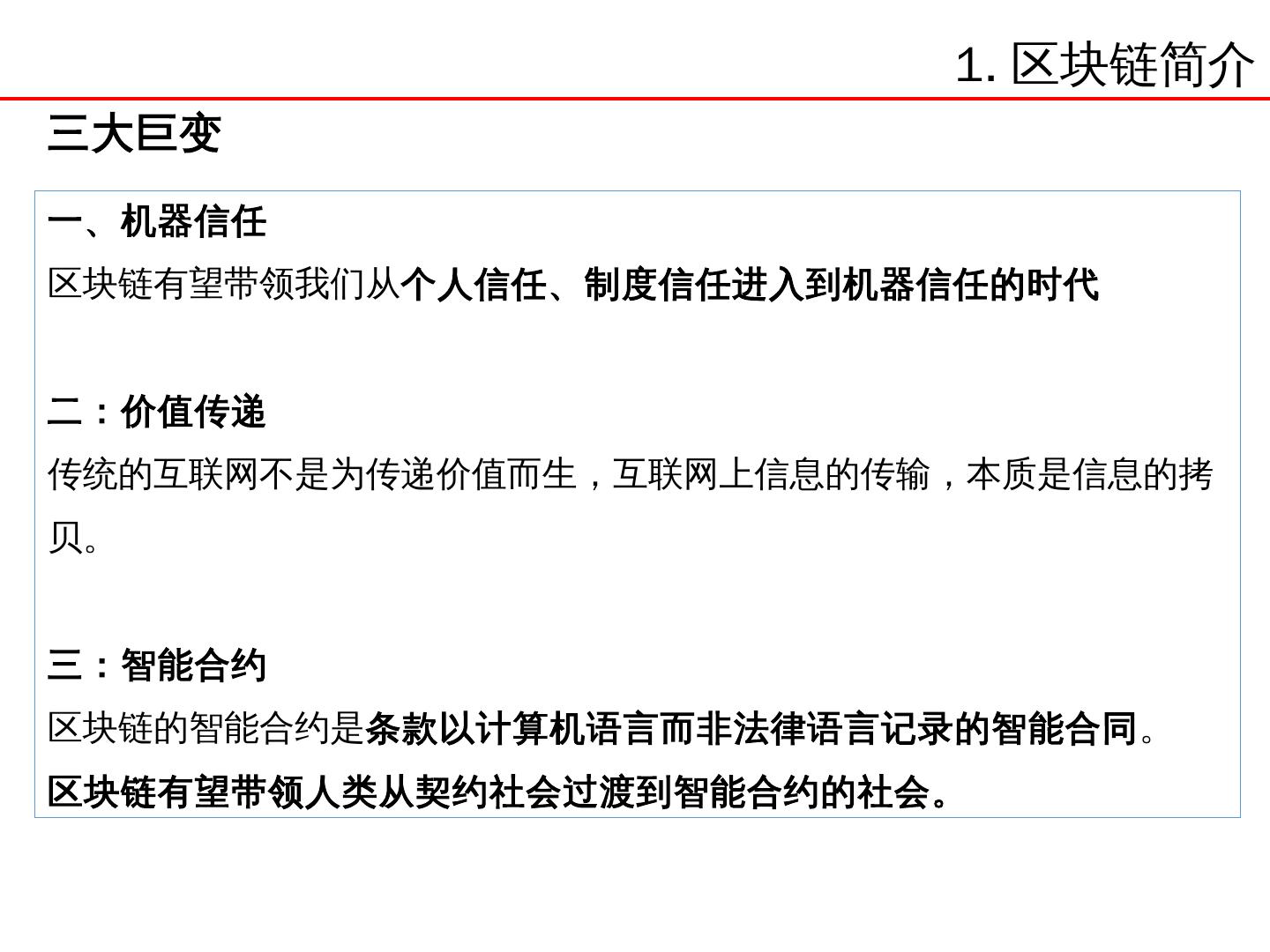 区块链的智能合约是条款以计算机语言而非法律语言记录的智能合同。 区块链有望带领人类从契约社会过渡到智能合约的社会。