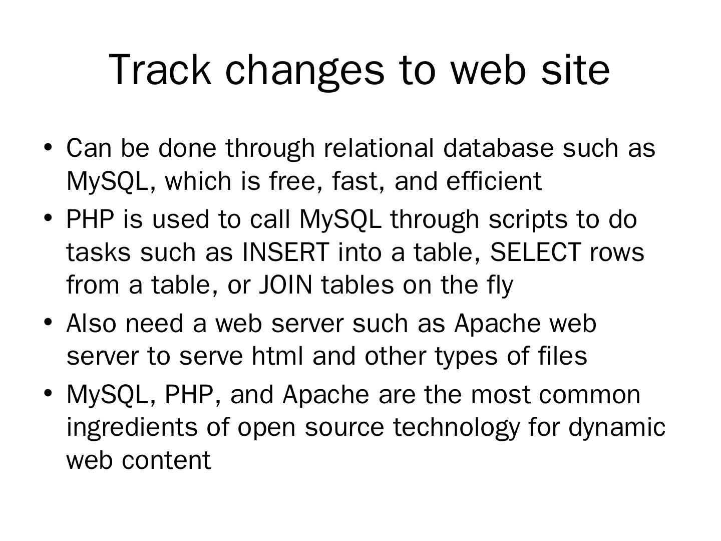 3 .Track changes to web site Can be done through relational database such as MySQL, which is free, fast, and efficient PHP is used to call MySQL through scripts to do tasks such as INSERT into a table, SELECT rows from a table, or JOIN tables on the fly Also need a web server such as Apache web server to serve html and other types of files MySQL, PHP, and Apache are the most common ingredients of open source technology for dynamic web content