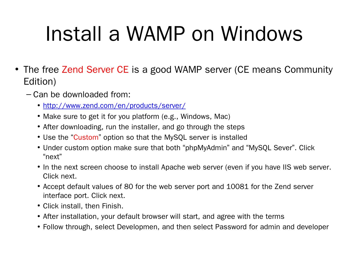 5 .Install a WAMP on Windows The free Zend Server CE is a good WAMP server (CE means Community Edition) Can be downloaded from: http://www.zend.com/en/products/server/ Make sure to get it for you platform (e.g., Windows, Mac) After downloading, run the installer, and go through the steps Use the “ Custom ” option so that the MySQL server is installed Under custom option make sure that both “ phpMyAdmin ” and “MySQL Sever”. Click “next” In the next screen choose to install Apache web server (even if you have IIS web server. Click next. Accept default values of 80 for the web server port and 10081 for the Zend server interface port. Click next. Click install, then Finish. After installation, your default browser will start, and agree with the terms Follow through, select Developmen , and then select Password for admin and developer