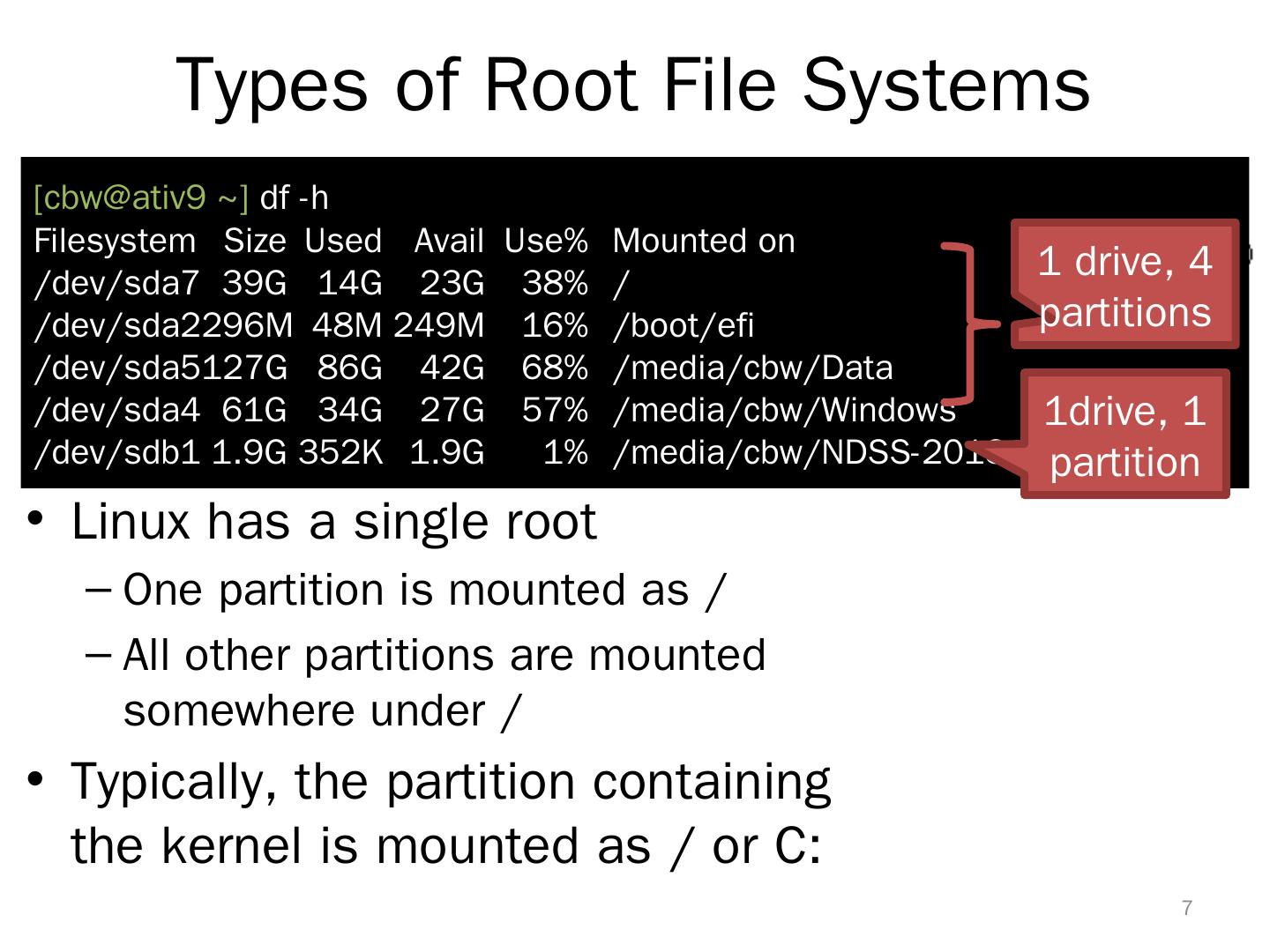 Types of Root File Systems. Windows exposes a multi-rooted system. Each device and partition is assigned a letter; Internally, a single root is maintained. Linux ...