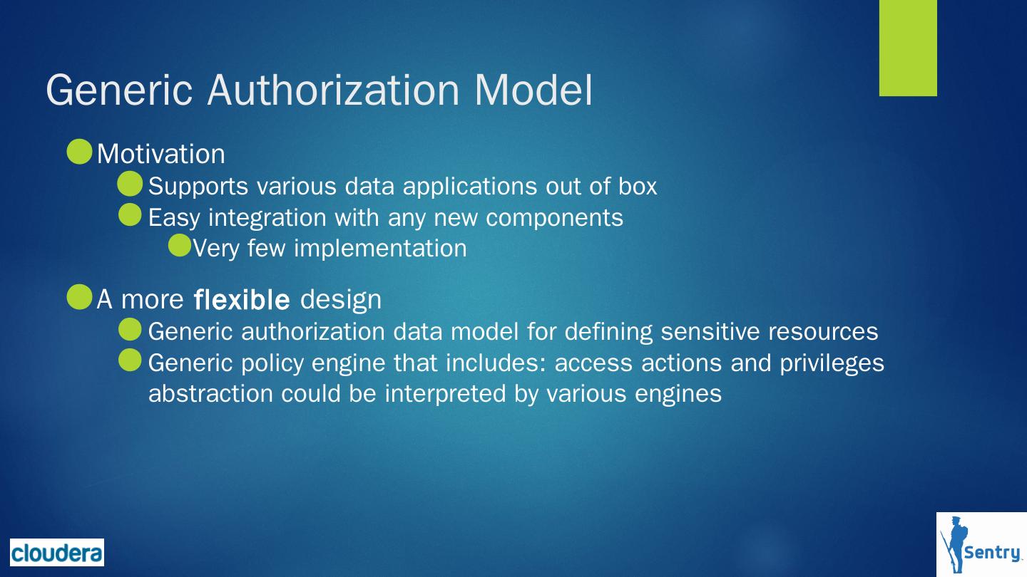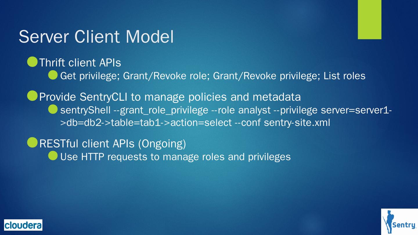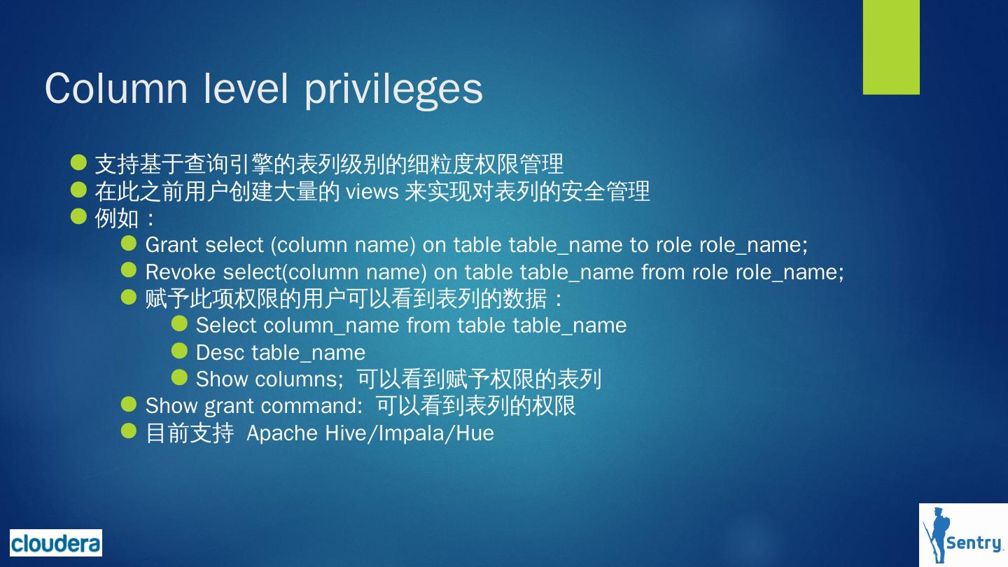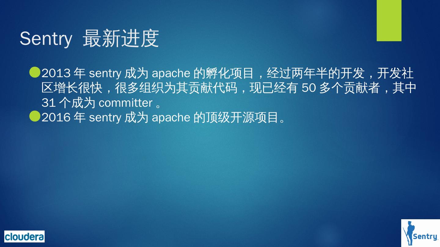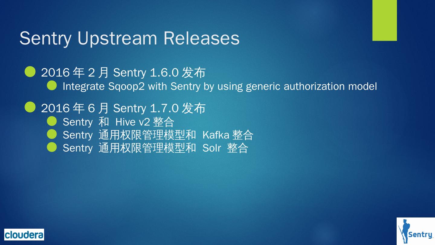 Sentry 对hadoop上的数据提供基于角色的细粒度授权服务(enforce role-based access ... Apache Solr, Apache Kafka, Apache Sqoop and Apache Impala的整合。