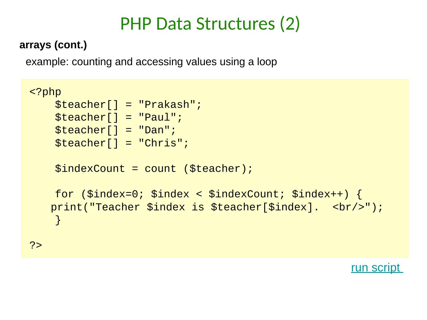 17 .<? php $teacher[] = " Prakash "; $teacher[] = "Paul"; $teacher[] = "Dan"; $teacher[] = "Chris"; $ indexCount = count ($teacher); for ($index=0; $index < $ indexCount ; $index++) { print ("Teacher $index is $teacher[$index]. < br />"); } ?> PHP Data Structures (2) example: counting and accessing values using a loop arrays (cont.) r un script