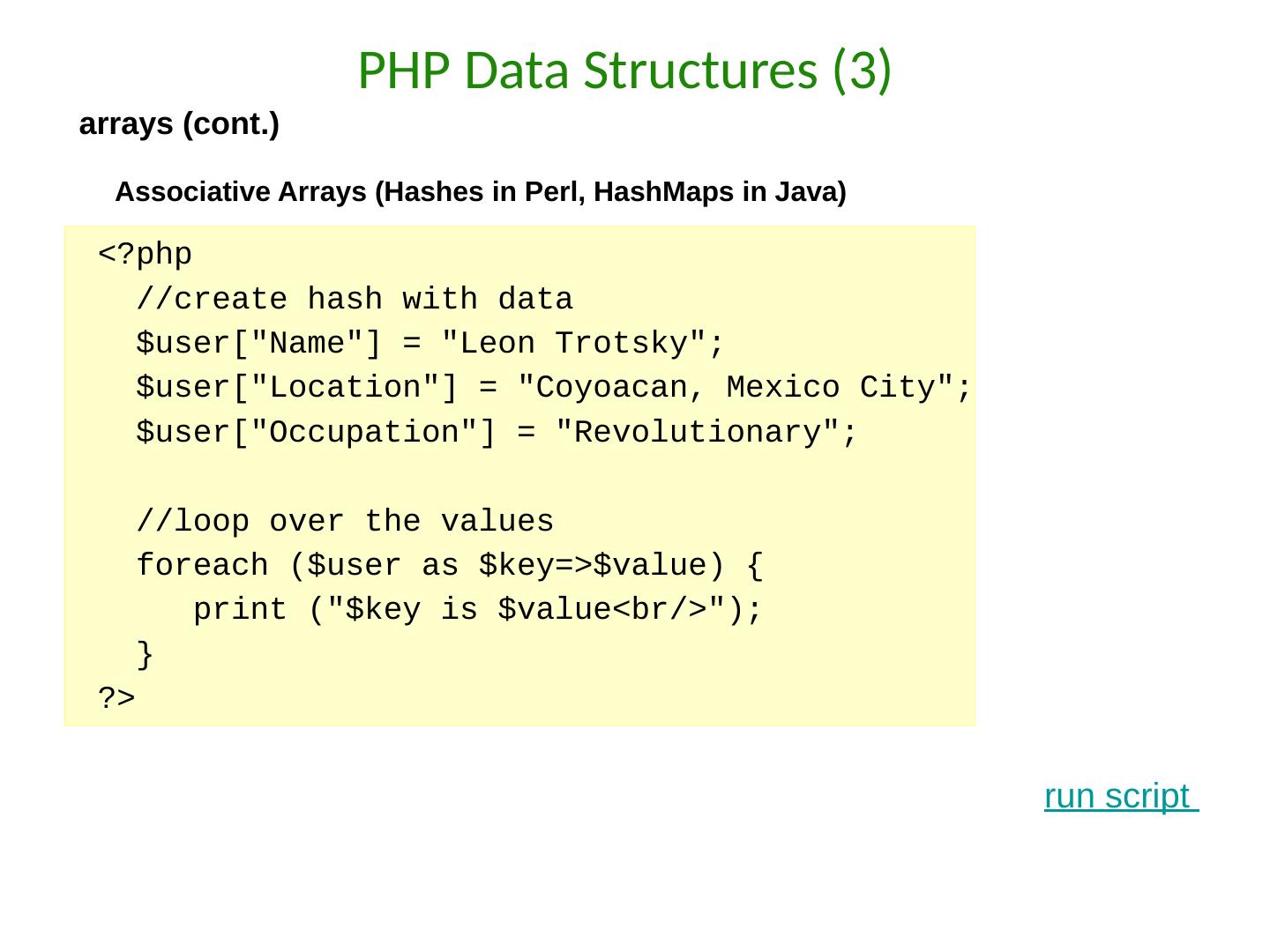 18 .<? php //create hash with data $user["Name"] = "Leon Trotsky"; $user["Location"] = " Coyoacan , Mexico City"; $user["Occupation"] = "Revolutionary"; //loop over the values foreach ($user as $key=>$value) { print ("$ key is $value< br />"); } ?> PHP Data Structures (3) arrays (cont.) Associative Arrays (Hashes in Perl, HashMaps in Java) r un script