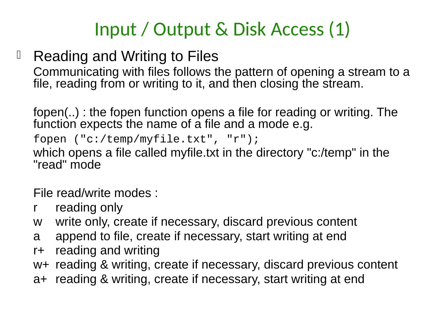 20 .Input / Output & Disk Access (1) Reading and Writing to Files Communicating with files follows the pattern of opening a stream to a file, reading from or writing to it, and then closing the stream. fopen (..) : the fopen function opens a file for reading or writing. The function expects the name of a file and a mode e.g. fopen ("c:/temp/myfile.txt", "r"); which opens a file called myfile.txt in the directory "c:/temp" in the "read" mode File read/write modes : r reading only w write only, create if necessary, discard previous content a append to file, create if necessary, start writing at end r+ reading and writing w+ reading & writing, create if necessary, discard previous content a+ reading & writing, create if necessary, start writing at end