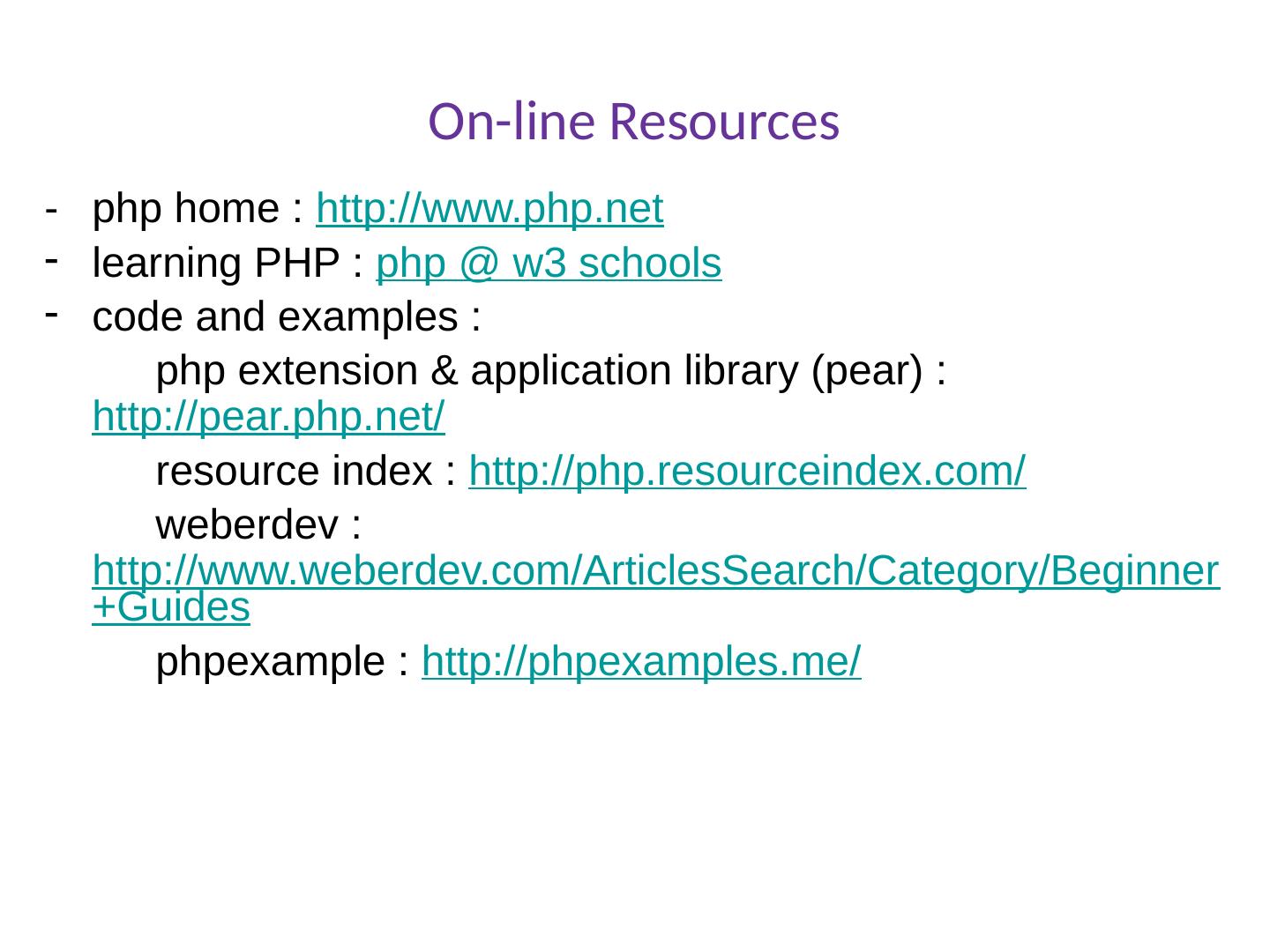24 .On-line Resources - php home : http://www.php.net learning PHP : php @ w3 schools code and examples : php extension & application library (pear) : http://pear.php.net/ resource index : http://php.resourceindex.com/ weberdev : http://www.weberdev.com/ArticlesSearch/Category/Beginner+Guides phpexample : http://phpexamples.me/