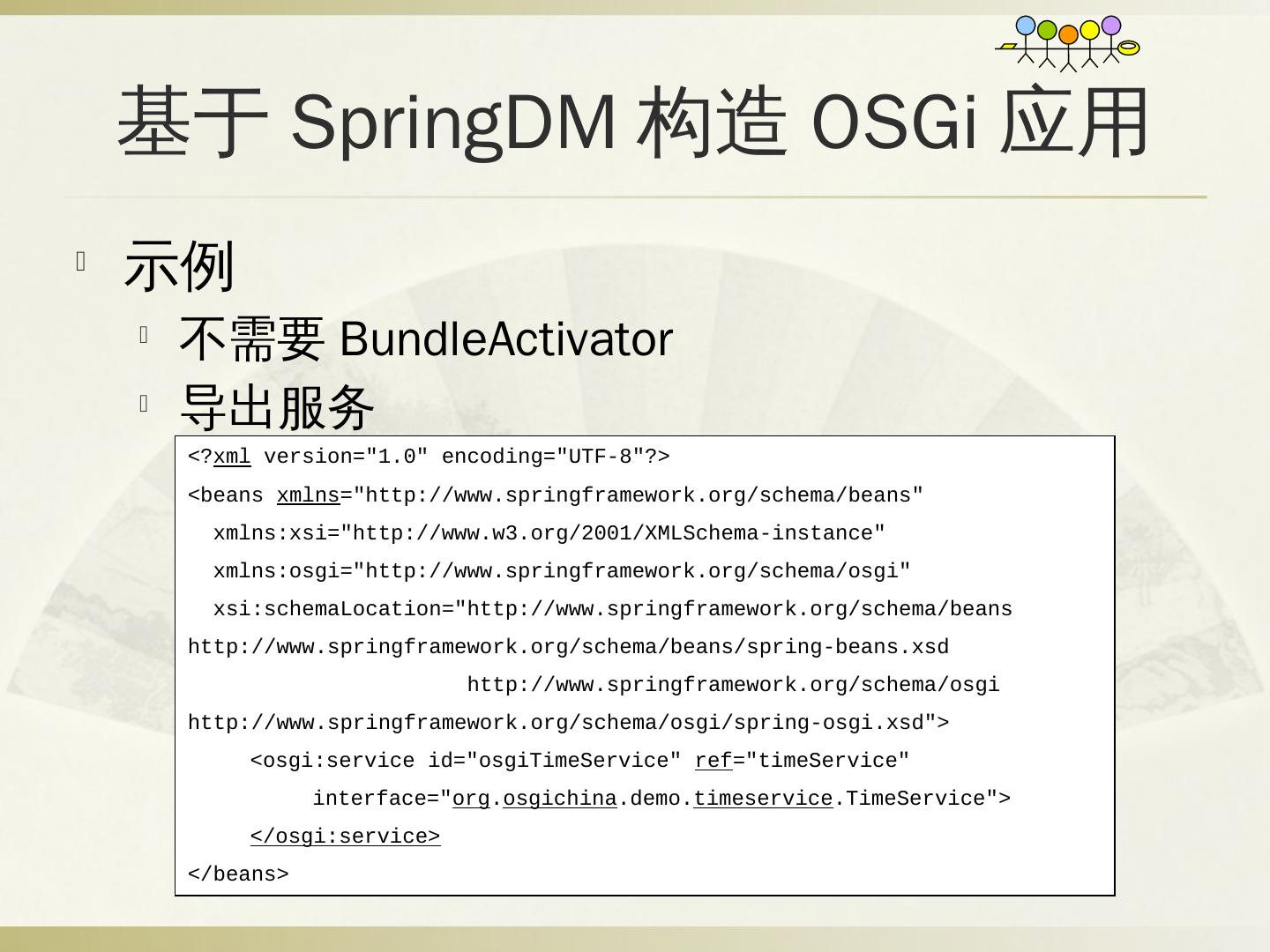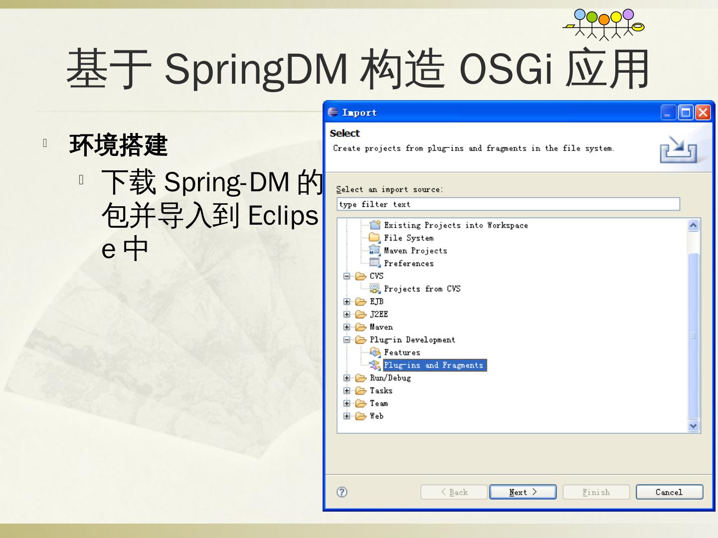 昨日回顾; OSGi Demo; Spring介绍; OSGi规范-Service Layer以及Services; 基于Spring DM构造OSGi应用; 回顾和讨论. 昨日回顾. Spring. Spring 框架概述.