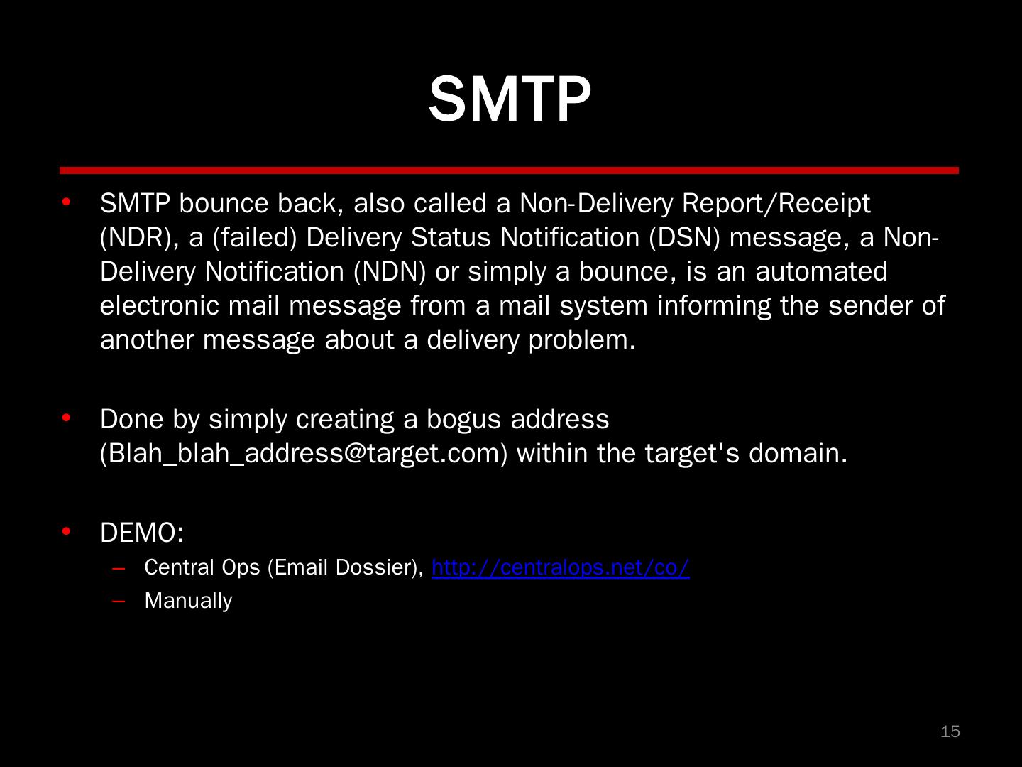 SMTP bounce back, also called a Non-Delivery Report/Receipt (NDR), a (failed) Delivery Status Notification (DSN) message, a Non-Delivery Notification (NDN) ...