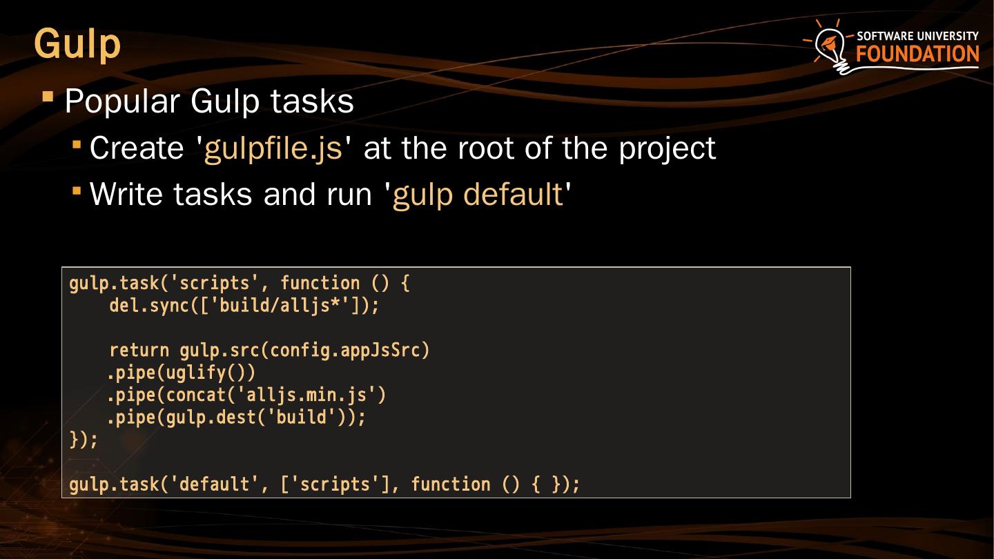 Run "npm install –g gulp" and then "npm install gulp"; It can runs different tasks, based on configuration. Concatenate and minify JavaScript/CSS files; Compile ...