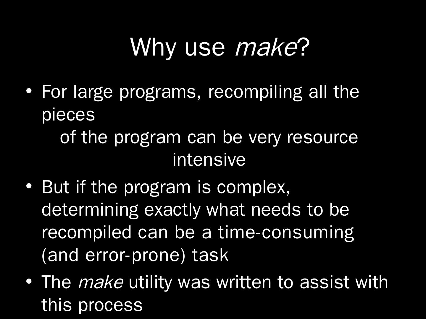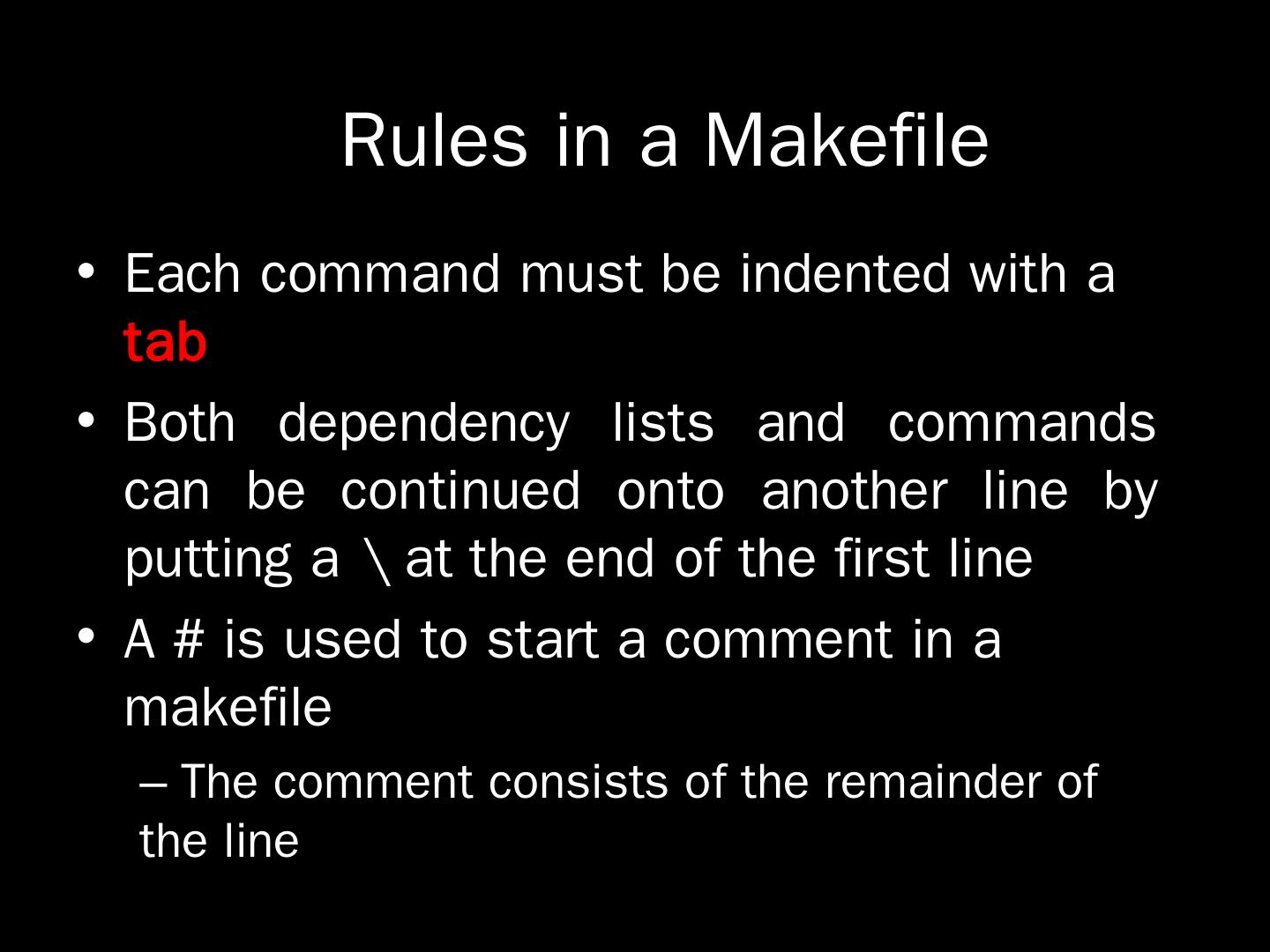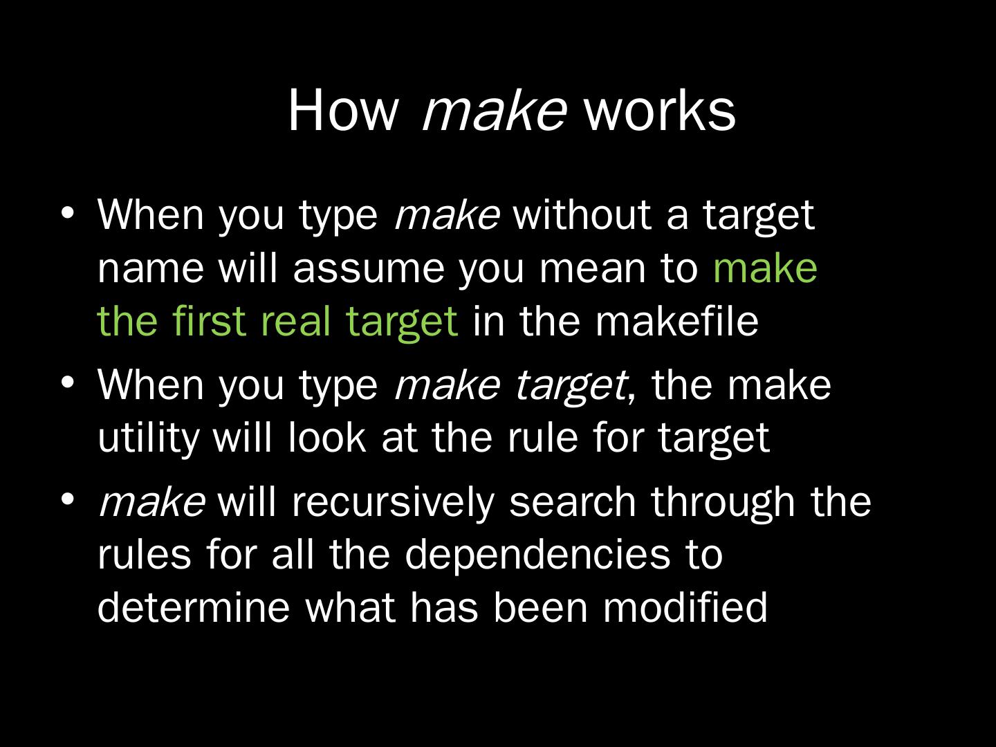 Makefile contains a set of rules; When you run make, it uses the rules in the Makefile to determine what needs to be done; Make does the minimum amount of ...