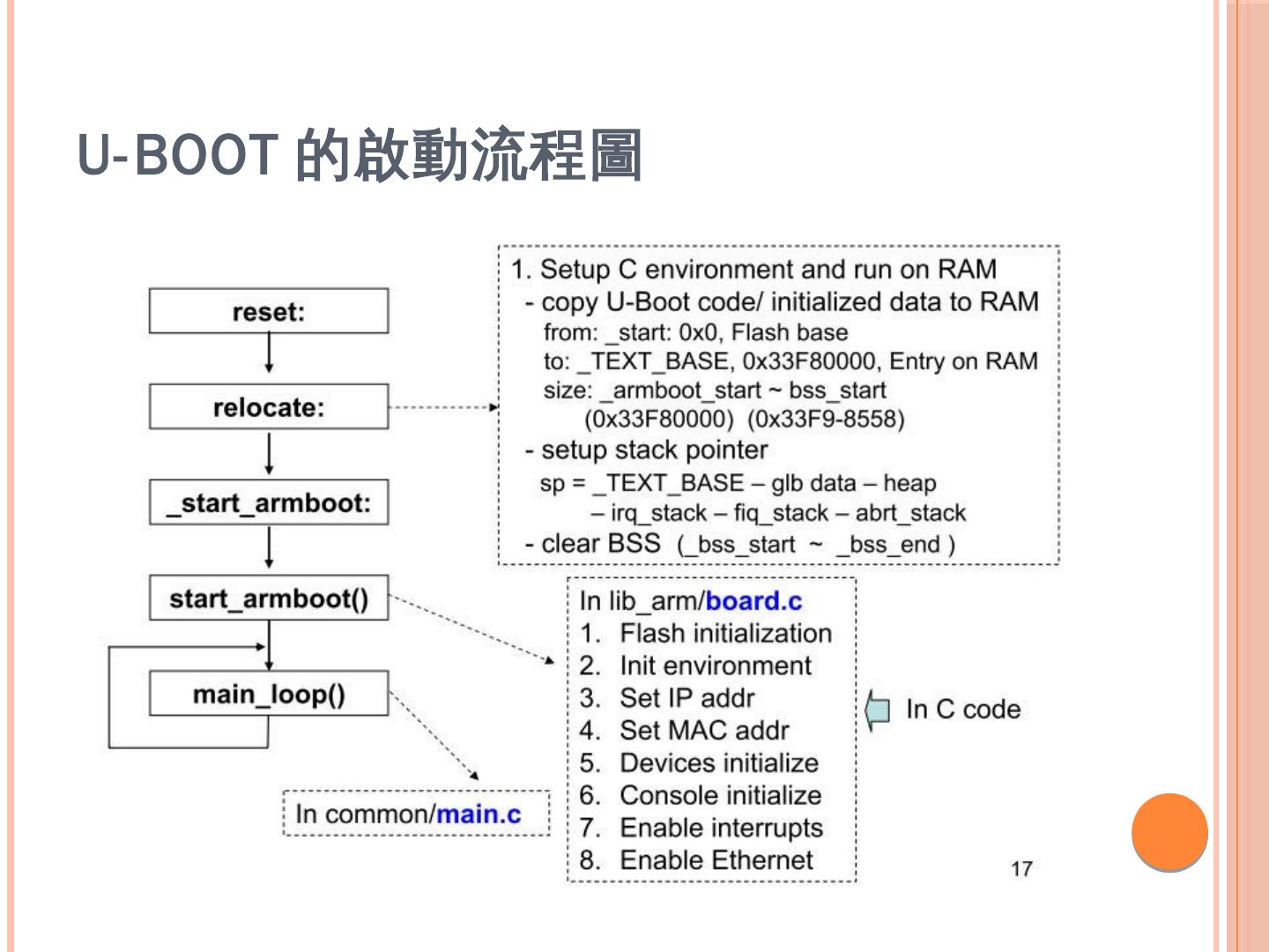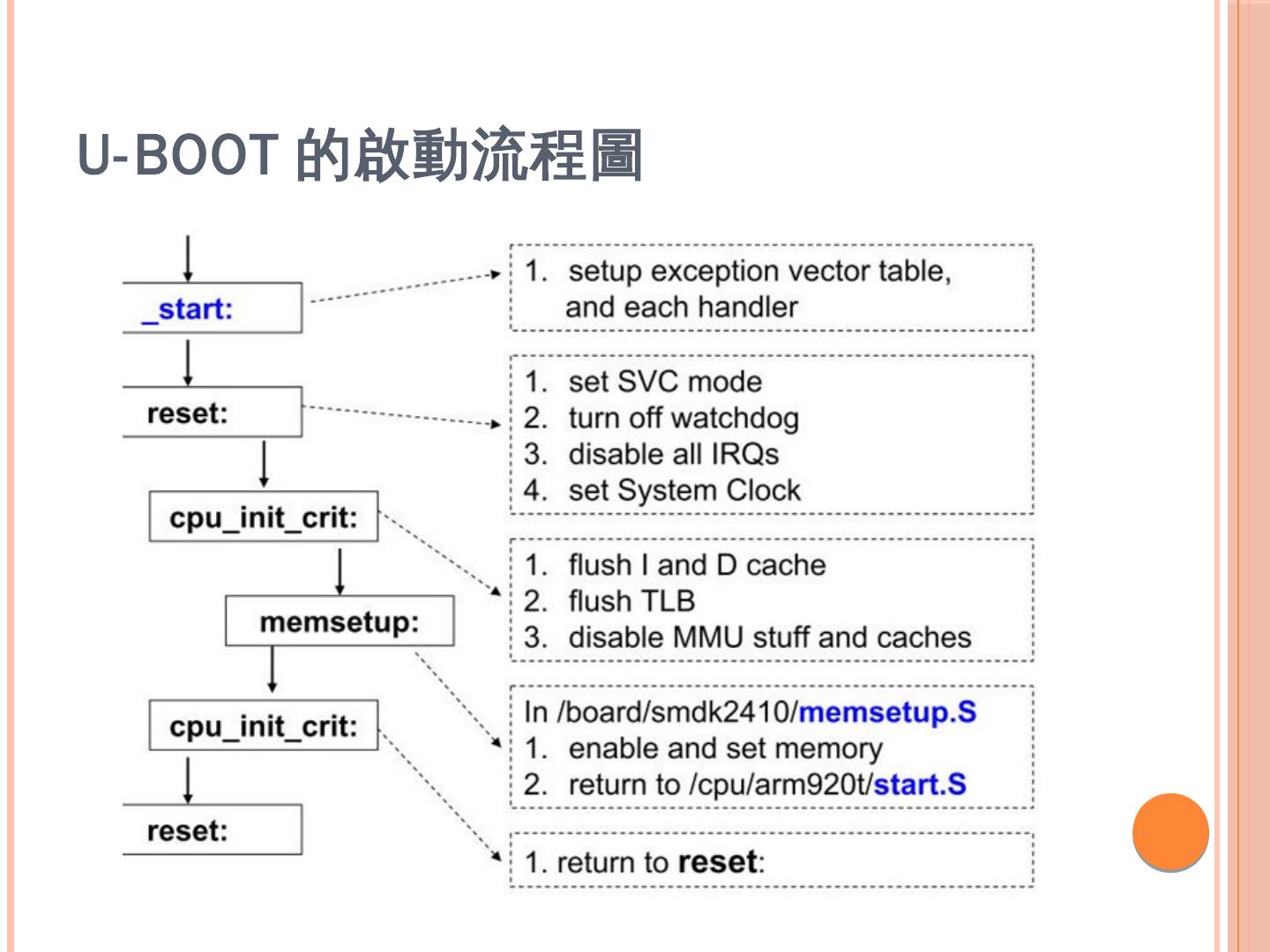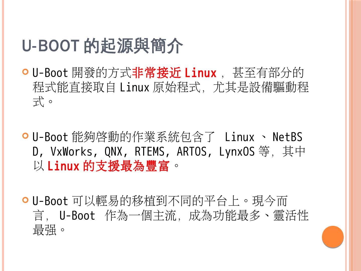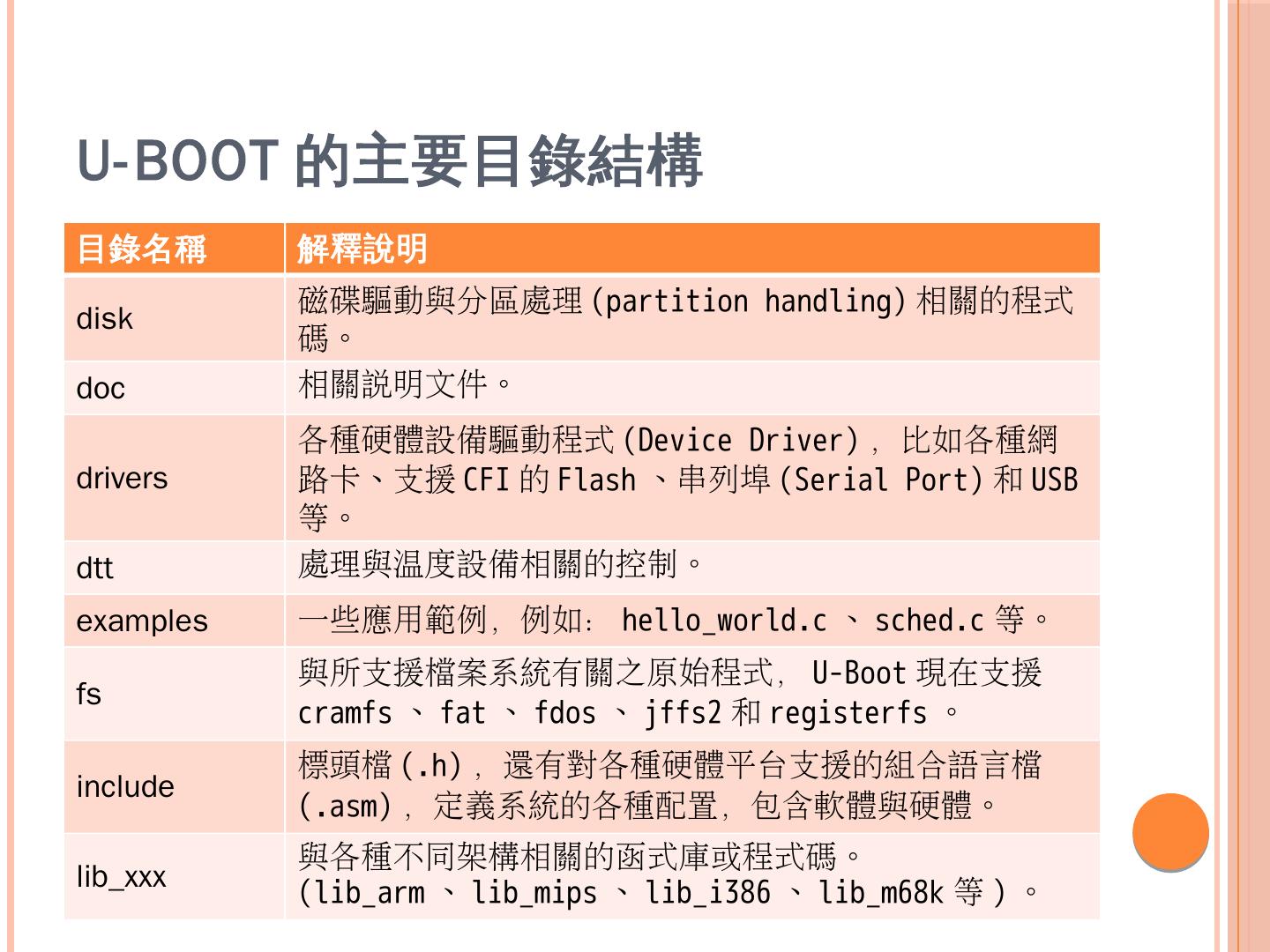 U-Boot開發的方式非常接近Linux,甚至有部分的程式能直接取自Linux原始程式,尤其是 ... drivers, 各種硬體設備驅動程式(Device Driver),比如各種網路卡、支援CFI ...