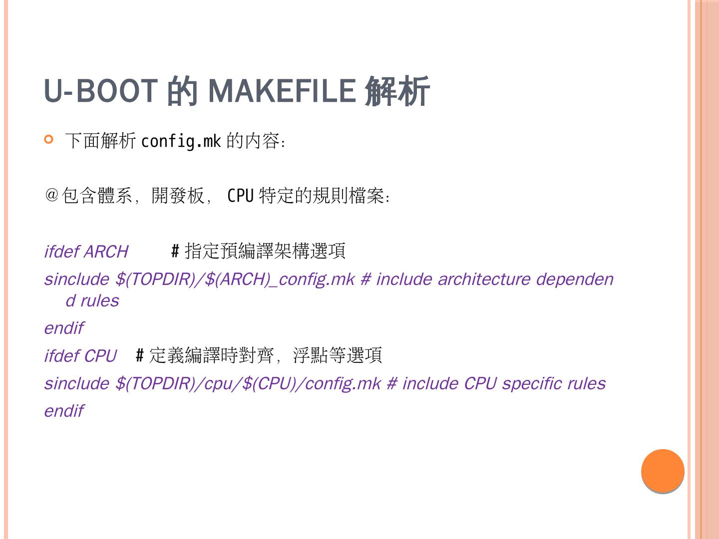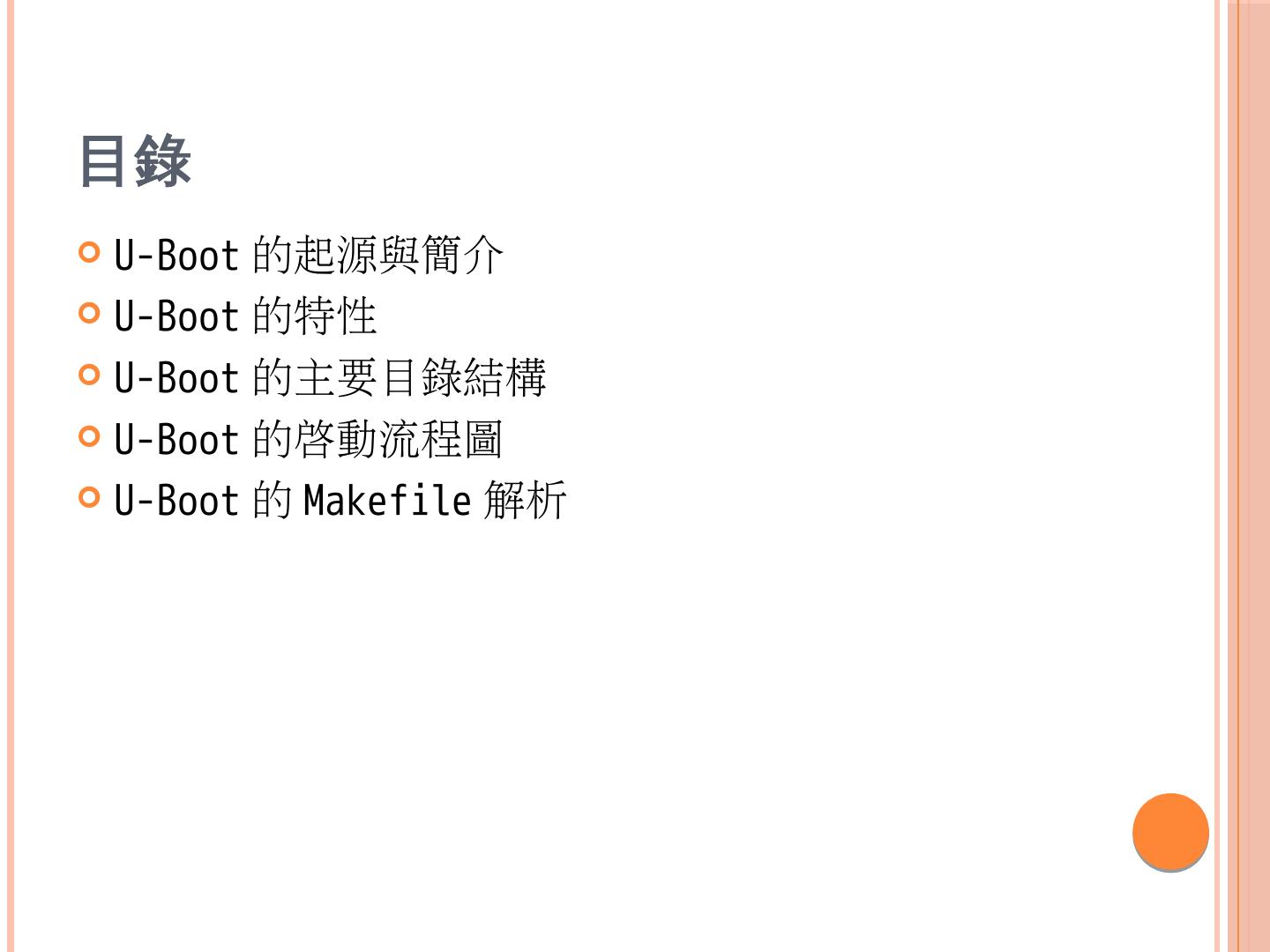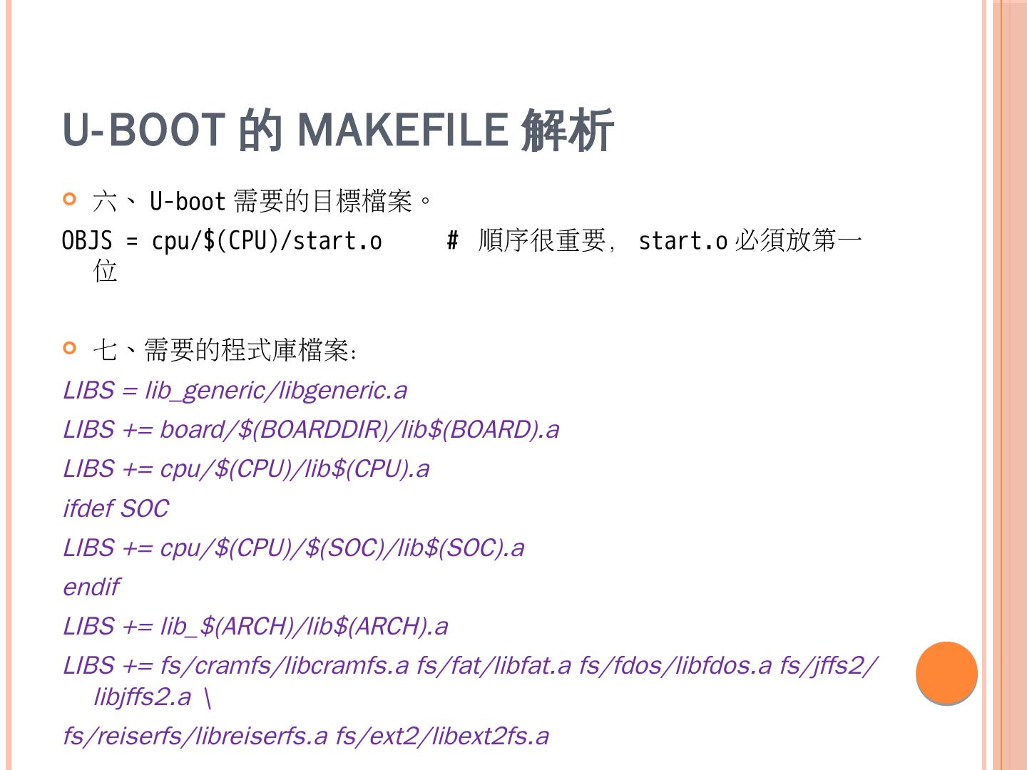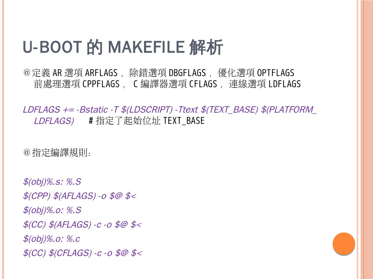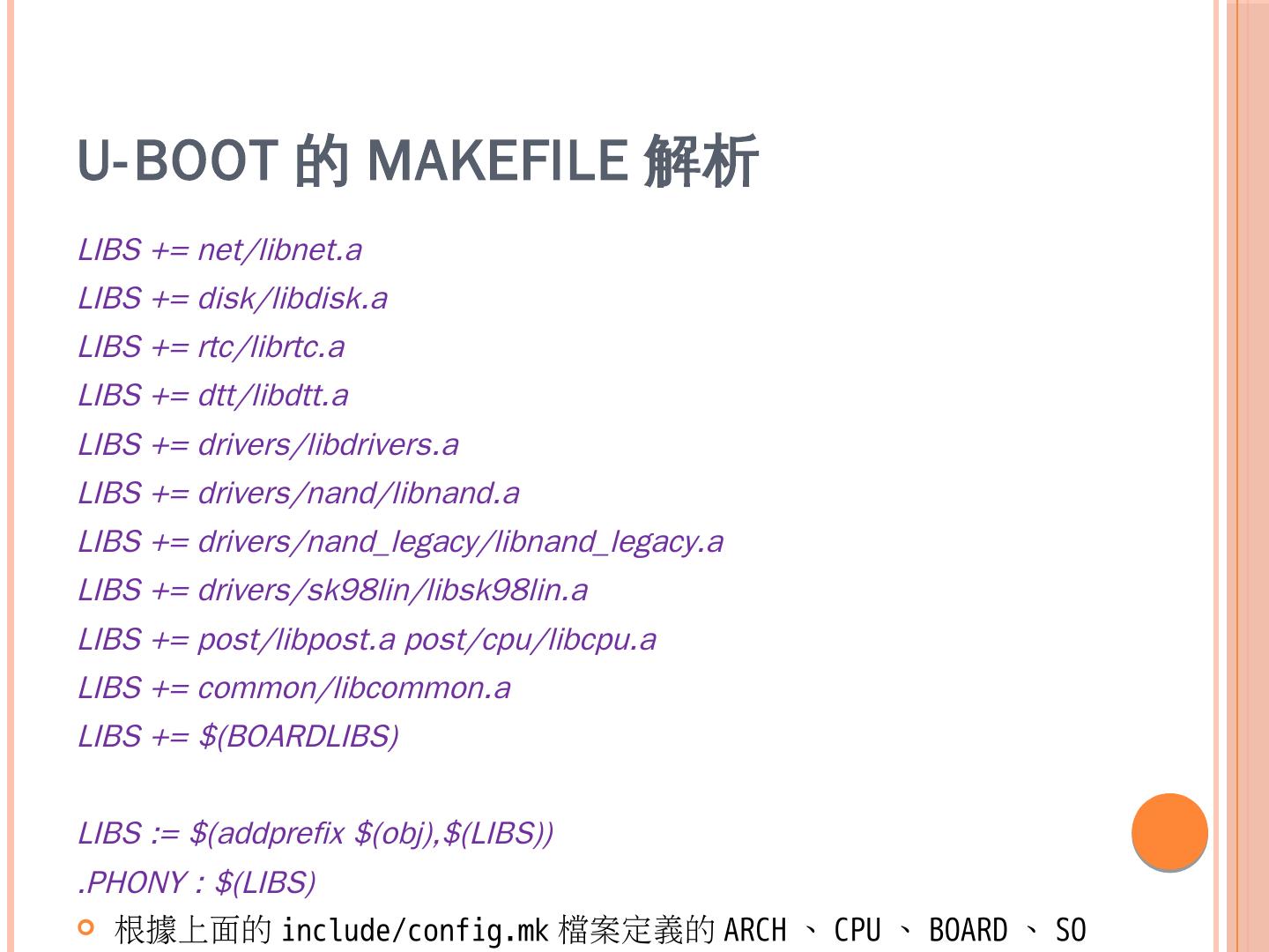 U-Boot開發的方式非常接近Linux,甚至有部分的程式能直接取自Linux原始程式,尤其是 ... drivers, 各種硬體設備驅動程式(Device Driver),比如各種網路卡、支援CFI ...