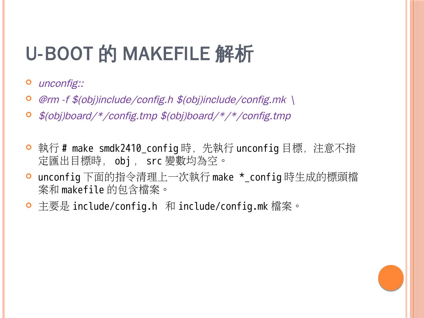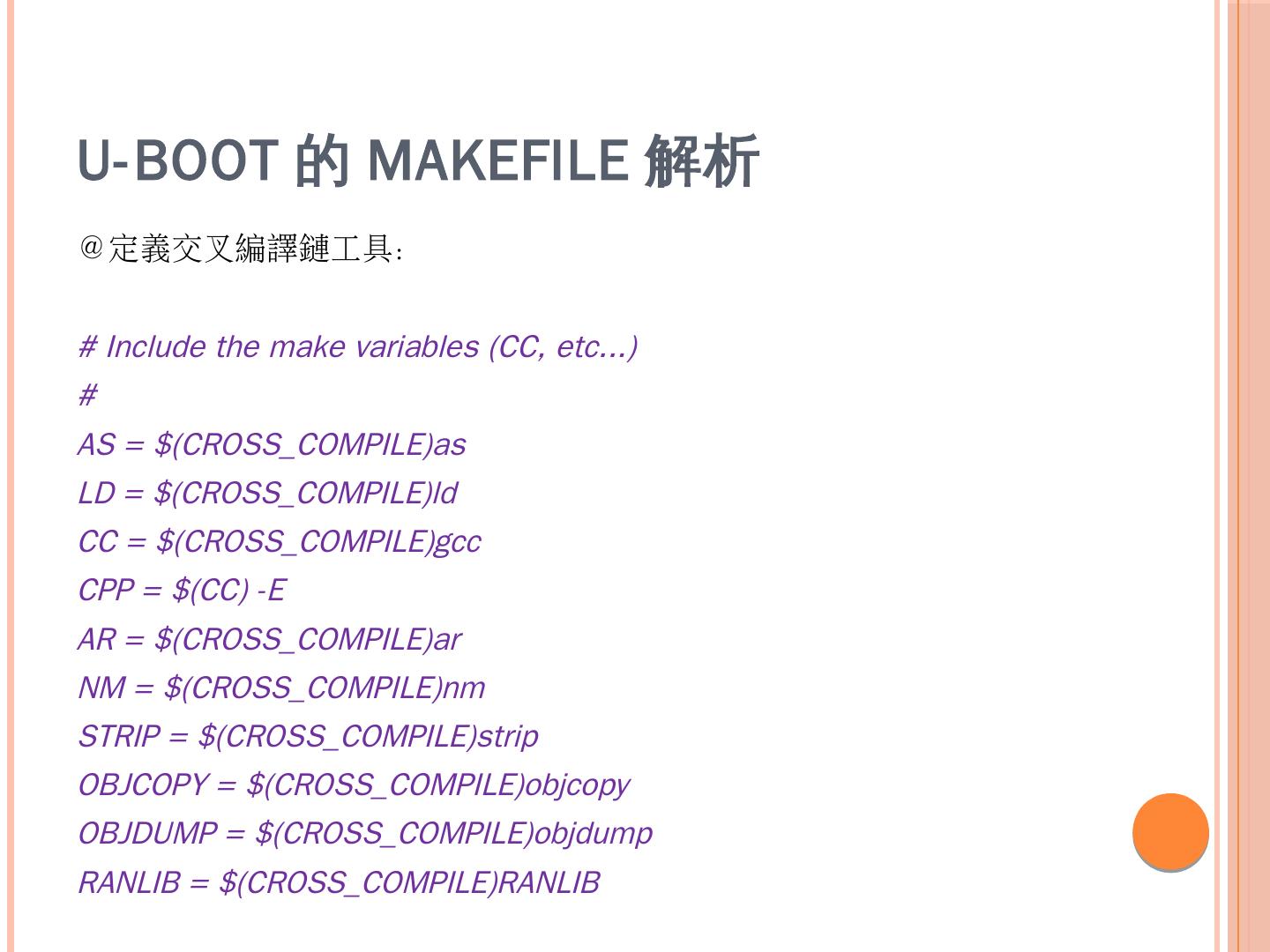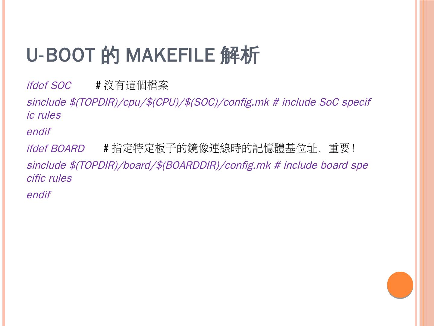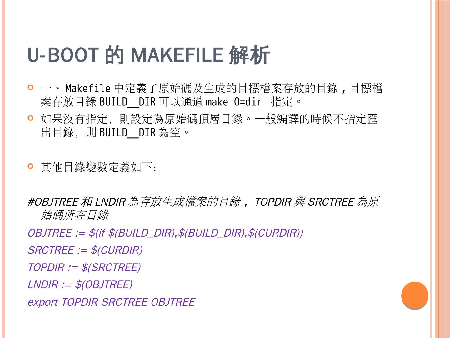 U-Boot開發的方式非常接近Linux,甚至有部分的程式能直接取自Linux原始程式,尤其是 ... drivers, 各種硬體設備驅動程式(Device Driver),比如各種網路卡、支援CFI ...