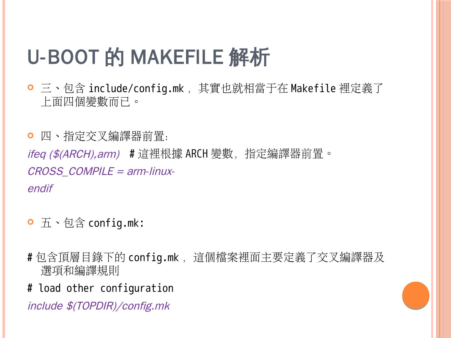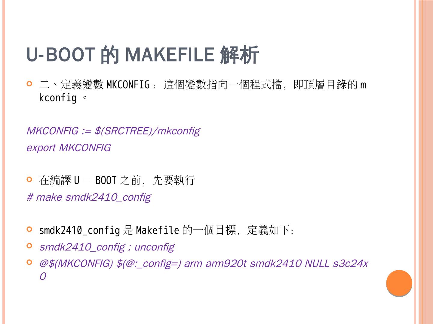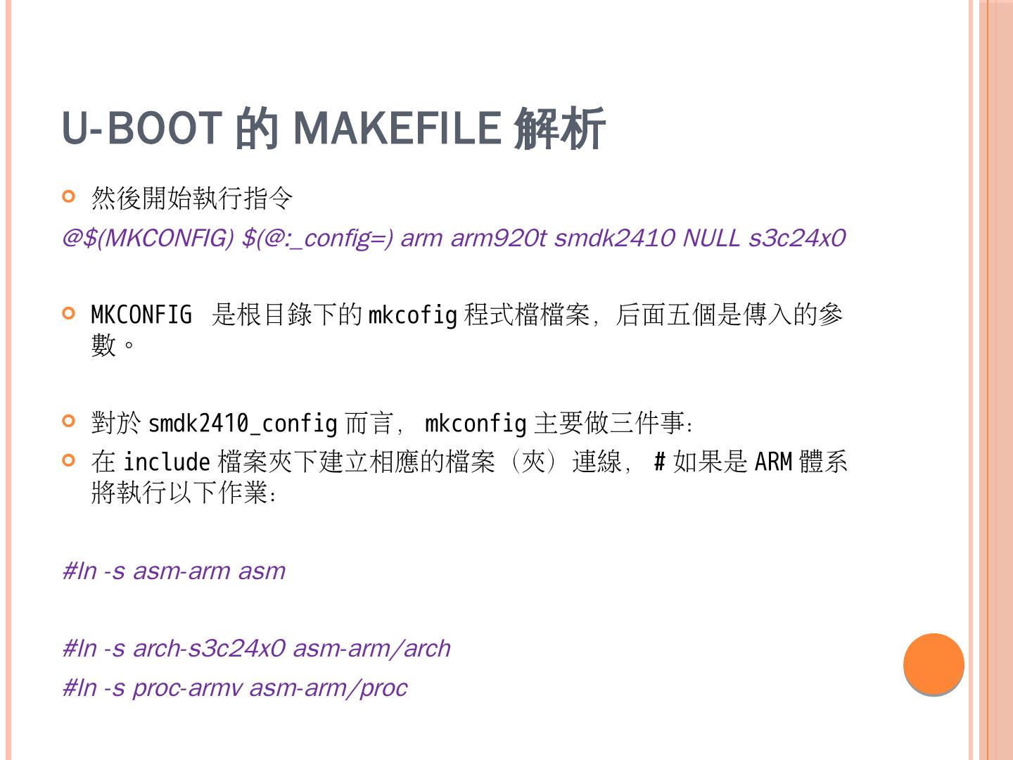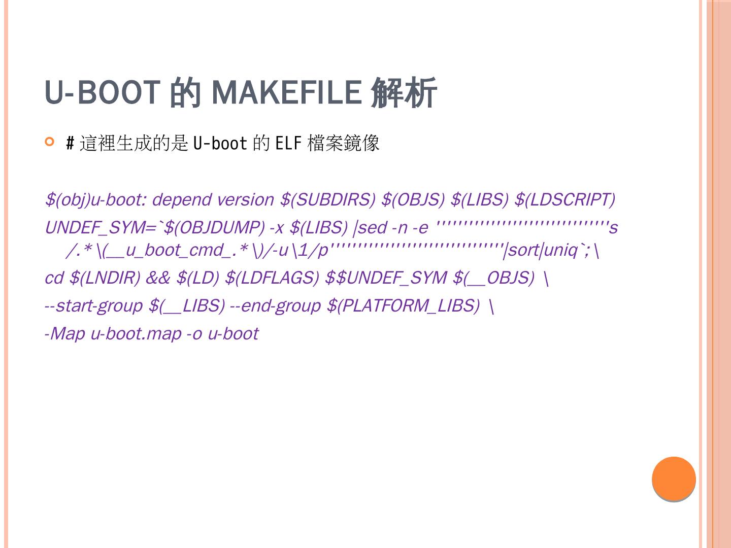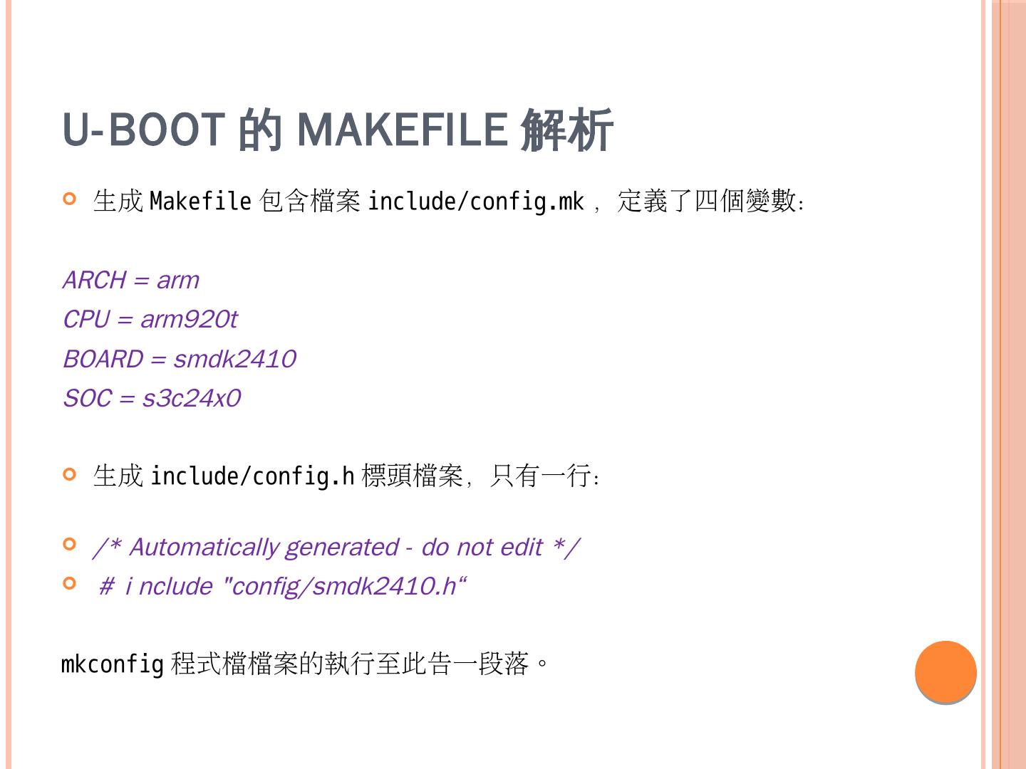 U-Boot開發的方式非常接近Linux,甚至有部分的程式能直接取自Linux原始程式,尤其是 ... drivers, 各種硬體設備驅動程式(Device Driver),比如各種網路卡、支援CFI ...