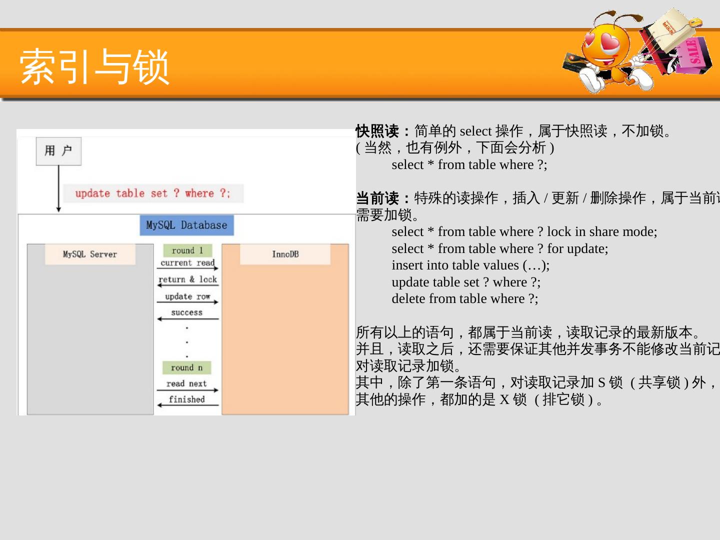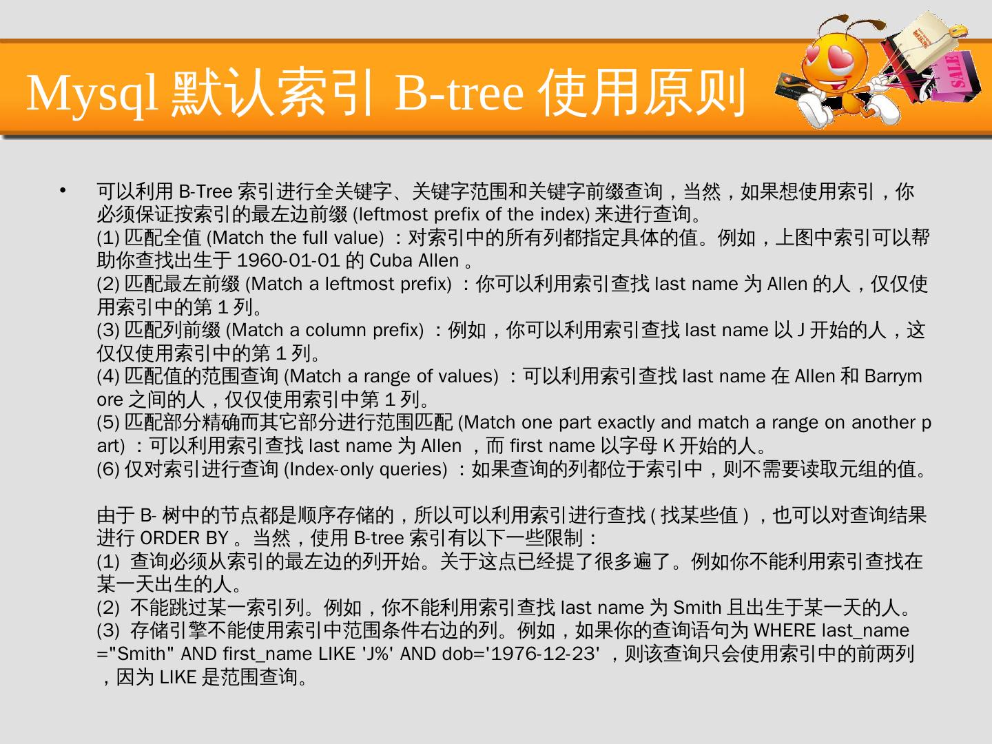 Mysql索引与锁. 索引底层数据结构( B-tree ). B-树的特性:. 1.关键字集合分布在整颗树中;. 2.任何一个关键字出现且只出现在一个结点中;. 3.搜索有可能在非叶子结 ...