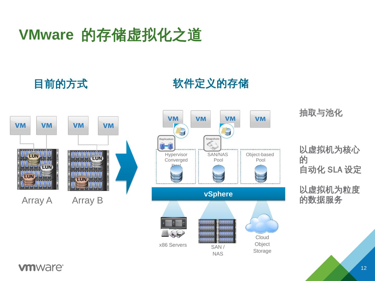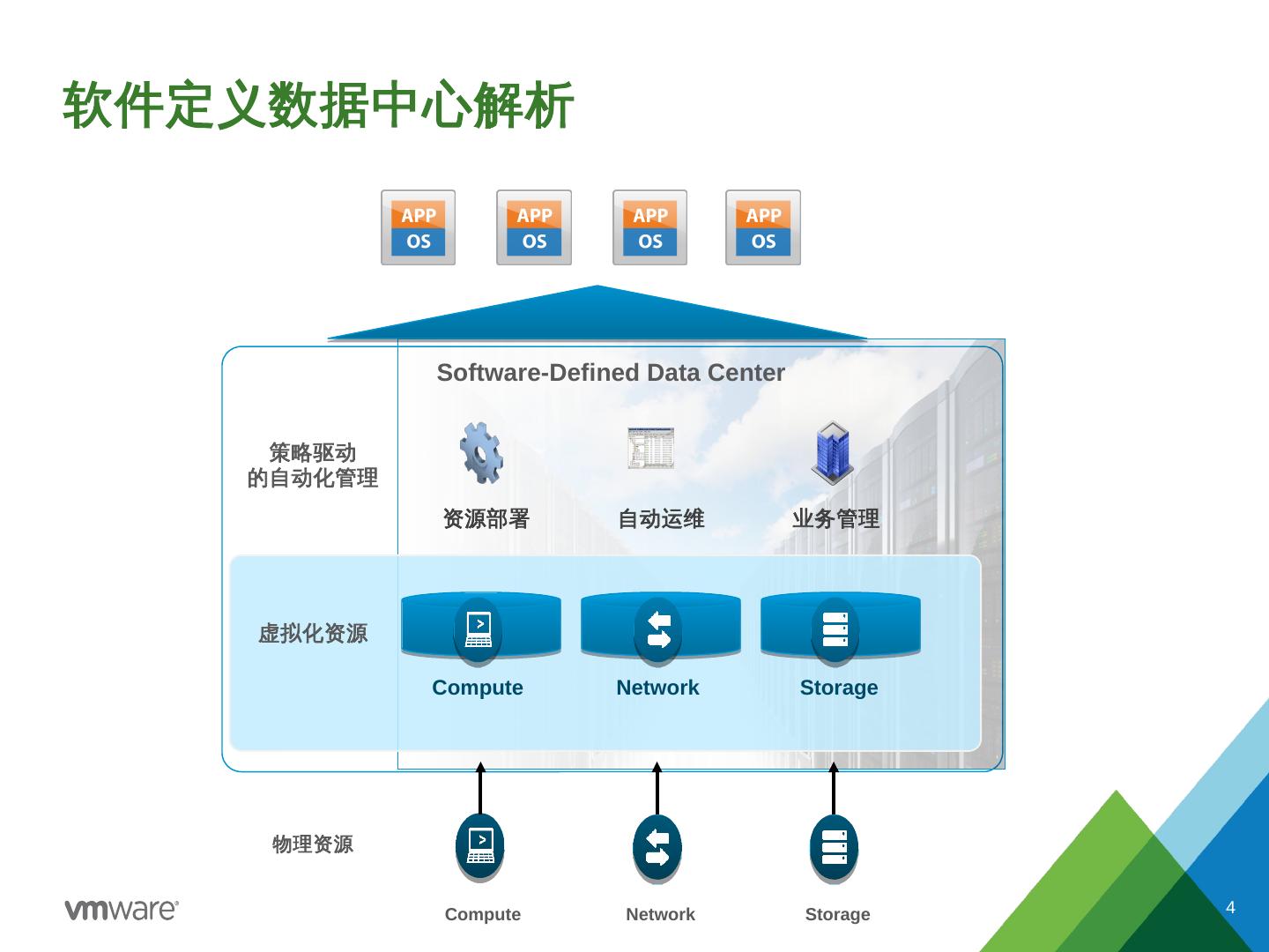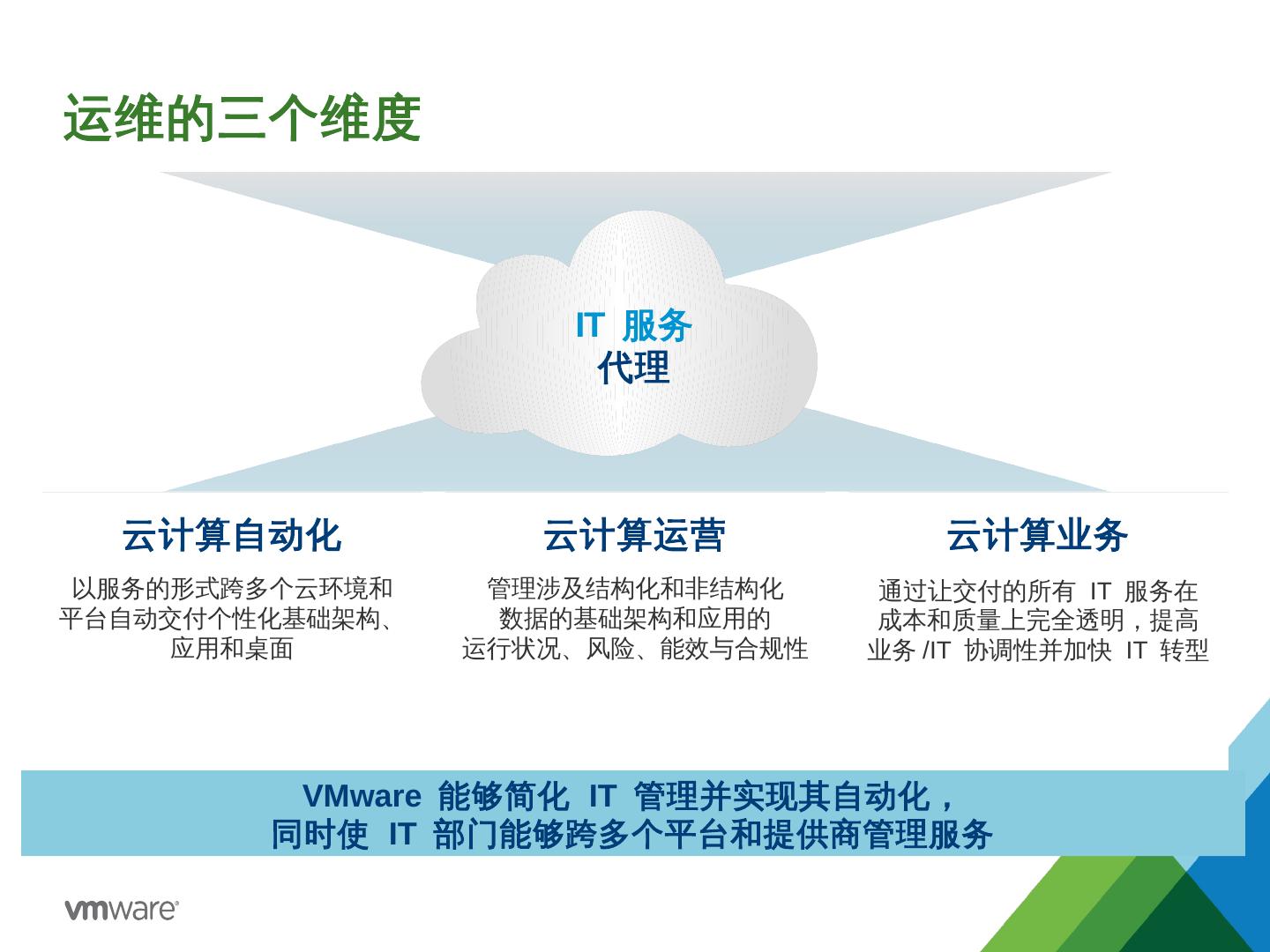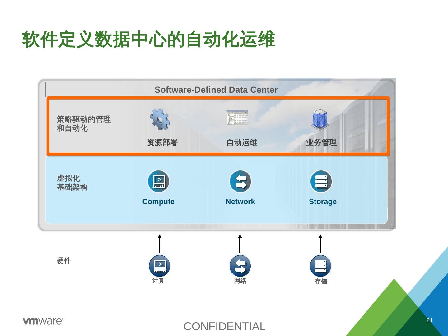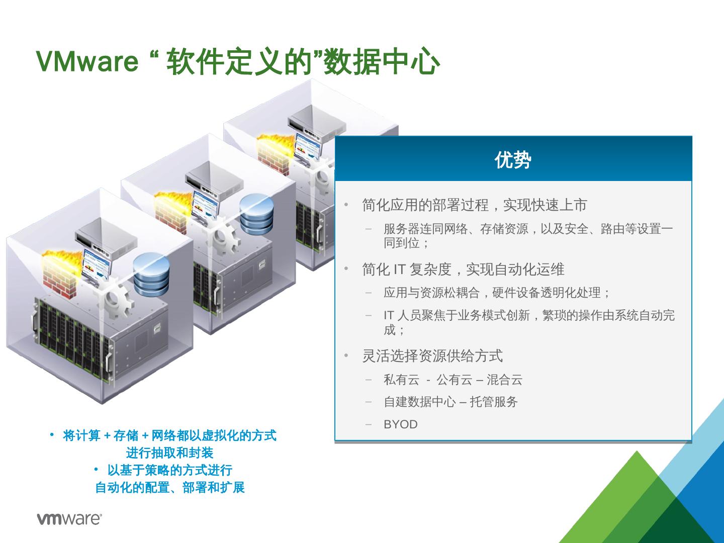 私有云- 公有云– 混合云; 自建数据中心– 托管服务; BYOD. 将计算+存储+网络都以虚拟化的方式 进行抽取和封装; 以基于策略的方式进行 自动化的配置、部署和扩展.