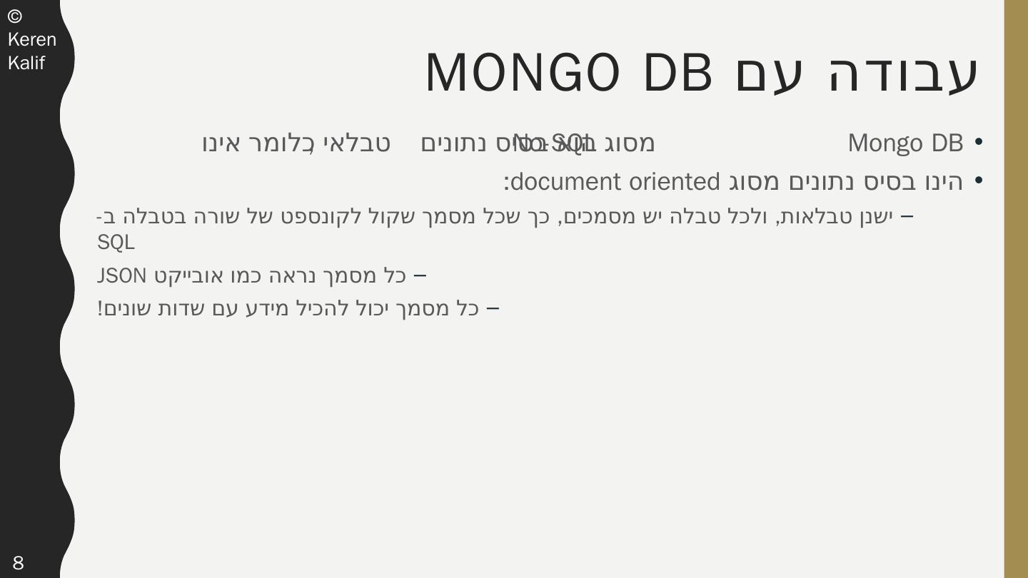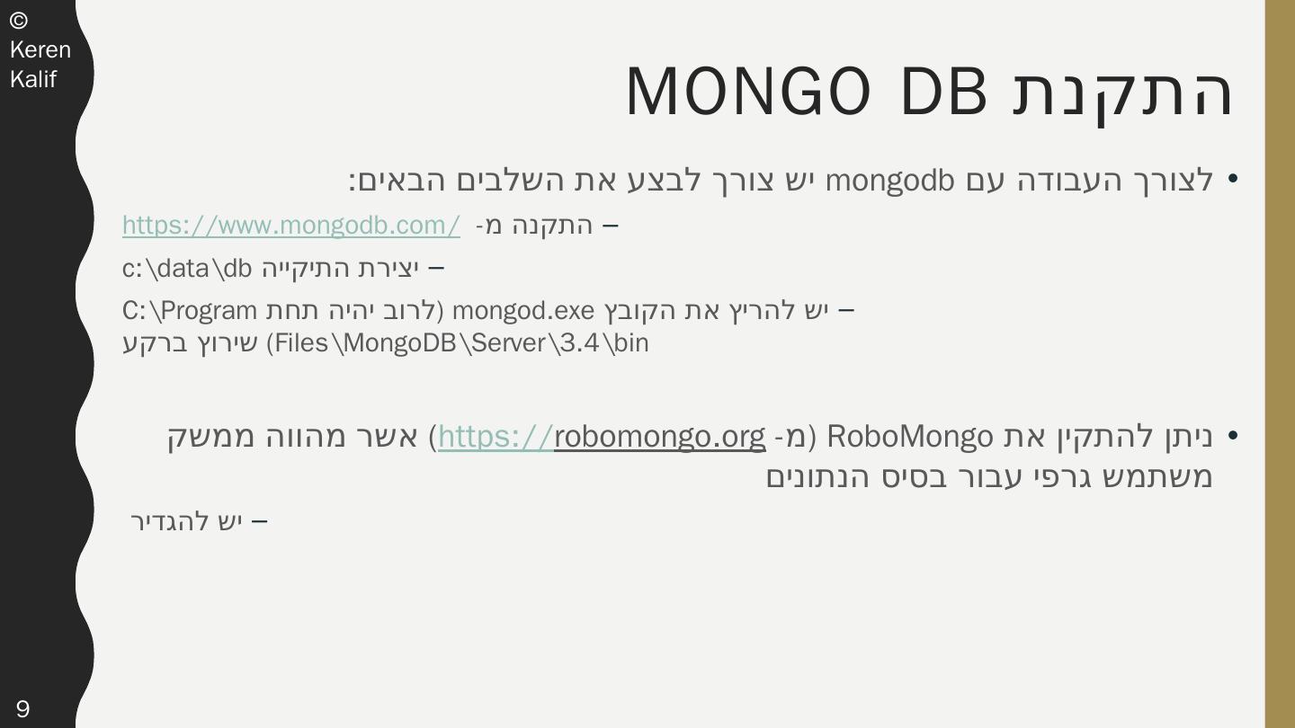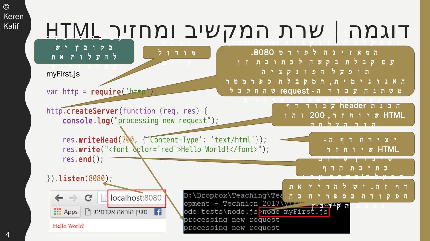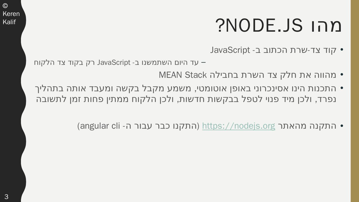 מהו node.js? קוד צד-שרת הכתוב ב- JavaScript. עד היום השתמשנו ב- JavaScript רק בקוד צד הלקוח. מהווה את חלק צד השרת בחבילה MEAN Stack; התכנות הינו אסינכרוני באופן ...