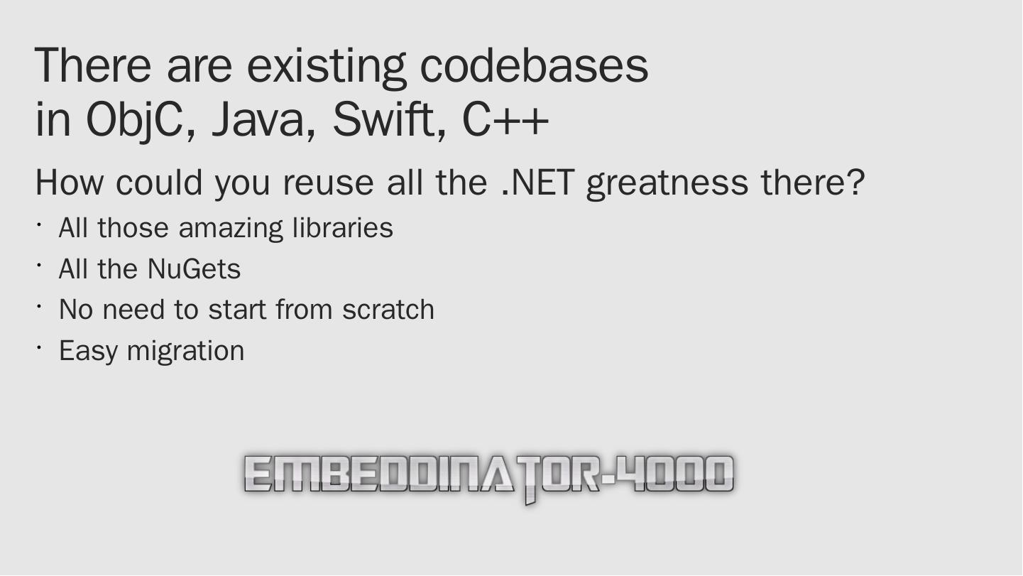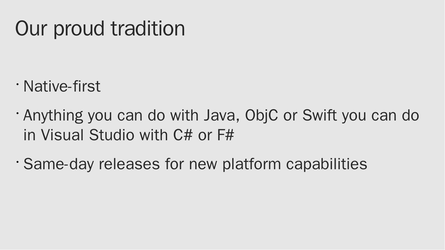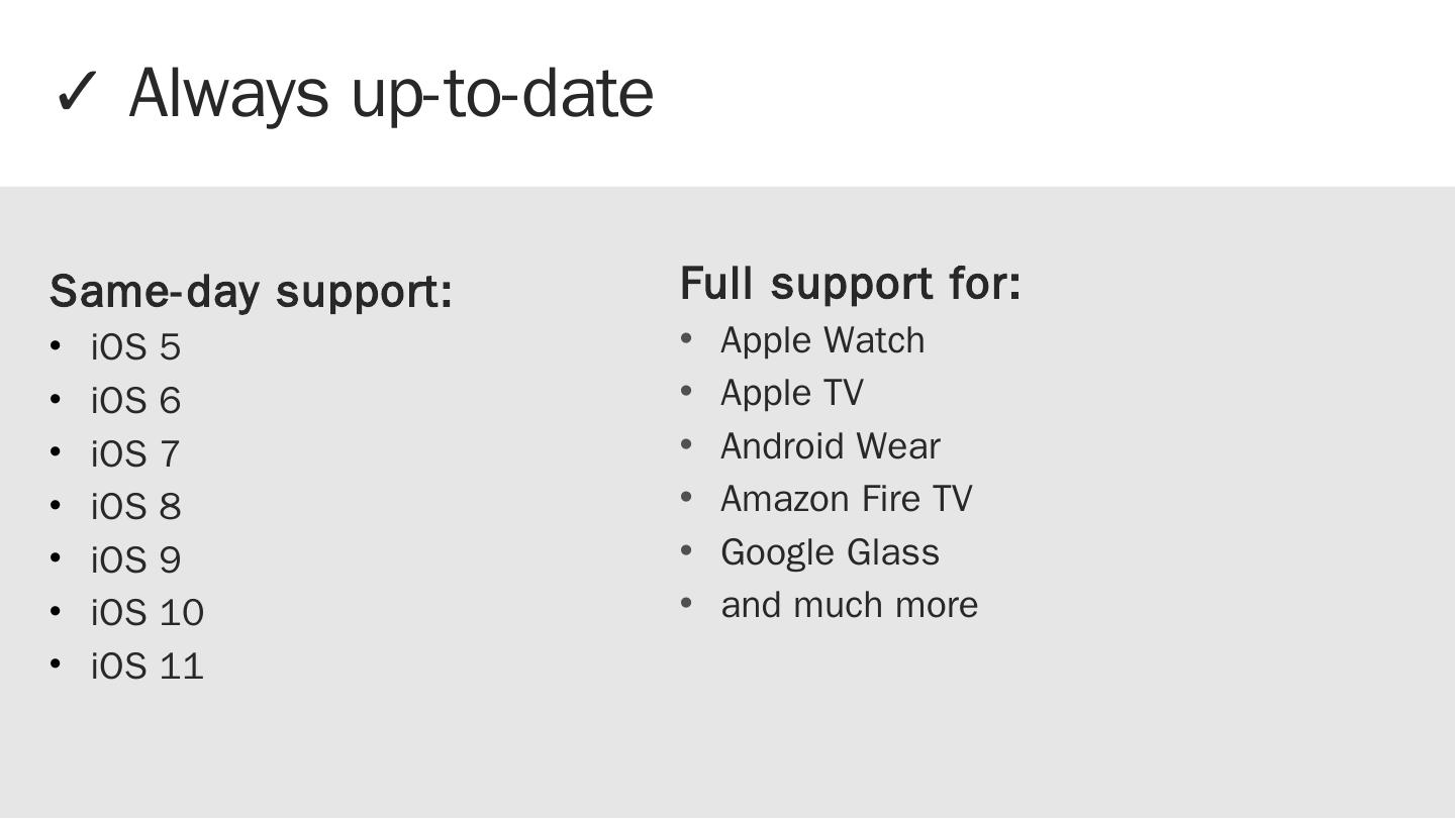 iOS 5; iOS 6; iOS 7; iOS 8; iOS 9; iOS 10; iOS 11. Full support for: ... Anything you can do in Objective-C, Swift, or Java can be done in C# with Xamarin. Demo.