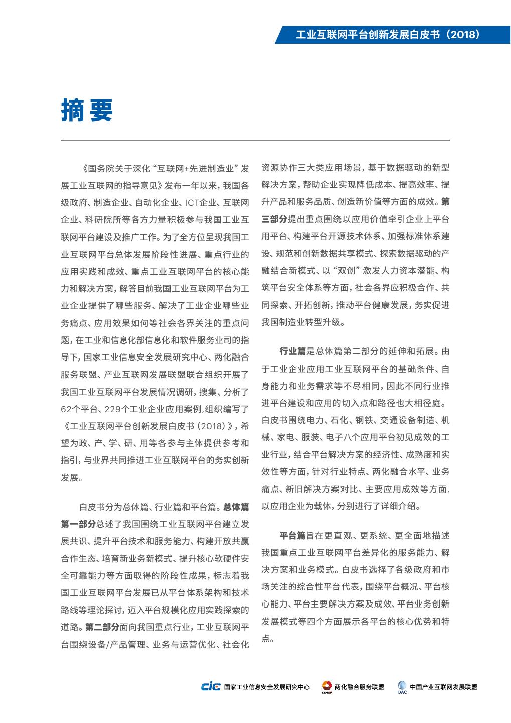 5 . 工业互联网平台创新发展白皮书(2018) 摘要 《国务院关于深化“互联网+先进制造业”发 资源协作三大类应用场景,基于数据驱动的新型 展工业互联网的指导意见》发布一年以来,我国各 解决方案,帮助企业实现降低成本、提高效率、提 级政府、制造企业、自动化企业、ICT企业、互联网 升产品和服务品质、创造新价值等方面的成效。第 企业、科研院所等各方力量积极参与我国工业互 三部分提出重点围绕以应用价值牵引企业上平台 联网平台建设及推广工作。为了全方位呈现我国工 用平台、构建平台开源技术体系、加强标准体系建 业互联网平台总体发展阶段性进展、重点行业的 设、规范和创新数据共享模式、探索数据驱动的产 应用实践和成效、重点工业互联网平台的核心能 融结合新模式、以“双创”激发人力资本潜能、构 力和解决方案,解答目前我国工业互联网平台为工 筑平台安全体系等方面,社会各界应积极合作、共 业企业提供了哪些服务、解决了工业企业哪些业 同探索、开拓创新,推动平台健康发展,务实促进 务痛点、应用效果如何等社会各界关注的重点问 我国制造业转型升级。 题,在工业和信息化部信息化和软件服务业司的指 行业篇是总体篇第二部分的延伸和拓展。由 导下,国家工业信息安全发展研究中心、两化融合 于工业企业应用工业互联网平台的基础条件、自 服务联盟、产业互联网发展联盟联合组织开展了 身能力和业务需求等不尽相同,因此不同行业推 我国工业互联网平台发展情况调研,搜集、分析了 进平台建设和应用的切入点和路径也大相径庭。 62个平台、229个工业企业应用案例,组织编写了 白皮书围绕电力、石化、钢铁、交通设备制造、机 《工业互联网平台创新发展白皮书(2018)》,希 械、家电、服装、电子八个应用平台初见成效的工 望为政、产、学、研、用等各参与主体提供参考和 业行业,结合平台解决方案的经济性、成熟度和实 指引,与业界共同推进工业互联网平台的务实创新 效性等方面,针对行业特点、两化融合水平、业务 发展。 痛点、新旧解决方案对比、主要应用成效等方面, 白皮书分为总体篇、行业篇和平台篇。总体篇 以应用企业为载体,分别进行了详细介绍。 第一部分总述了我国围绕工业互联网平台建立发 平台篇旨在更 直 观 、更系统、更全面地描述 展共识、提升平台技术和服务能力、构建开放共赢 我国重点工业互联网平台差异化的服务能力、解 合作生态、培育新业务新模式、提升核心软硬件安 决方案和业务模式。白皮书选择了各级政府和市 全可靠能力等方面取得的阶段性成果,标志着我 场关注的综合性平台代表,围绕平台概况、平台核 国工业互联网平台发展已从平台体系架构和技术 心能力、平台主要解决方案及成效、平台业务创新 路线等理论探讨,迈入平台规模化应用实践探索的 发展模式等四个方面展示各平台的核心优势和特 道路。第二部分面向我国重点行业,工业互联网平 点。 台围绕设备/产品管理、业务与运营优化、社会化 国家工业信息安全发展研究中心 两化融合服务联盟 中国产业互联网发展联盟
