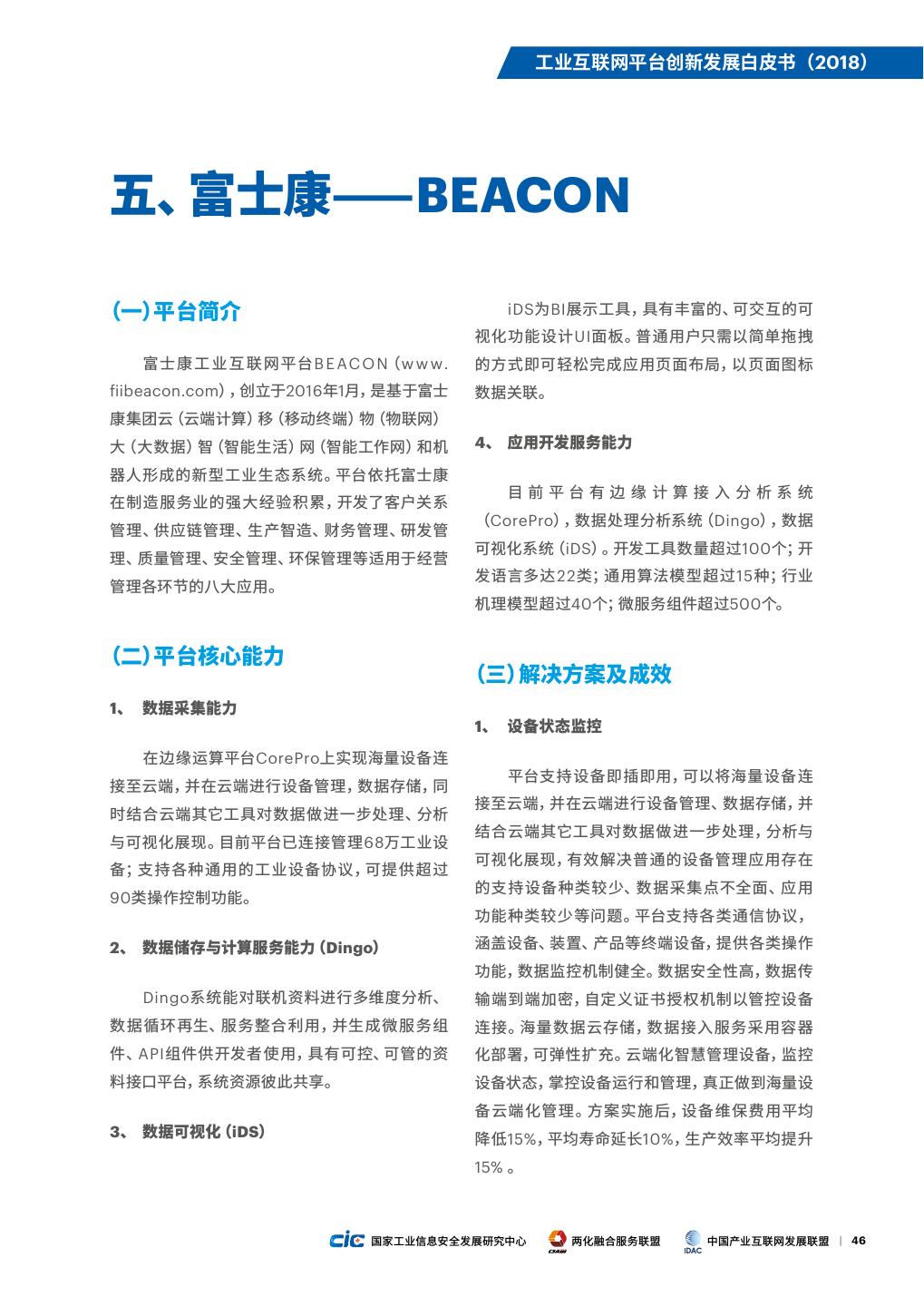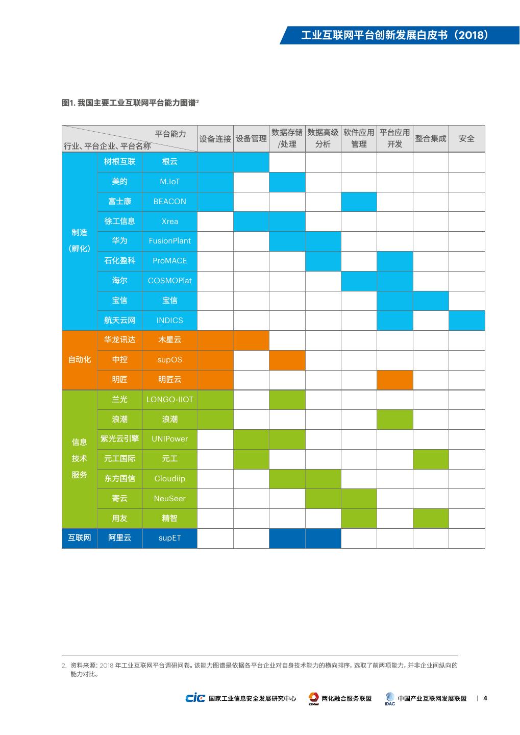 11 . 工业互联网平台创新发展白皮书(2018) 图1. 我国主要工业互联网平台能力图谱2 平台能力 数据存储 数据高级 软件应用 平台应用 设备连接 设备管理 整合集成 安全 行业、平台企业、平台名称 /处理 分析 管理 开发 树根互联 根云 美的 M.IoT 富士康 BEACON 徐工信息 Xrea 制造 华为 FusionPlant (孵化) 石化盈科 ProMACE 海尔 COSMOPlat 宝信 宝信 航天云网 INDICS 华龙讯达 木星云 自动化 中控 supOS 明匠 明匠云 兰光 LONGO-IIOT 浪潮 浪潮 信息 紫光云引擎 UNIPower 技术 元工国际 元工 服务 东方国信 Cloudiip 寄云 NeuSeer 用友 精智 互联网 阿里云 supET 2. 资料来源:2018 年工业互联网平台调研问卷。该能力图谱是依据各平台企业对自身技术能力的横向排序,选取了前两项能力,并非企业间纵向的 能力对比。 国家工业信息安全发展研究中心 两化融合服务联盟 中国产业互联网发展联盟 | 4