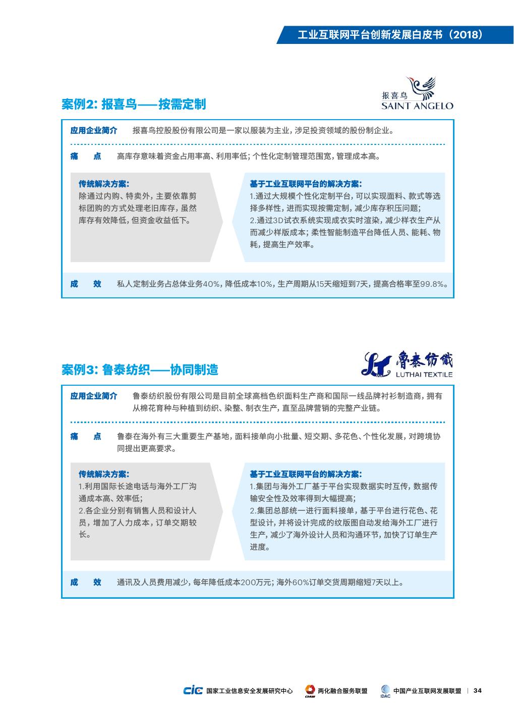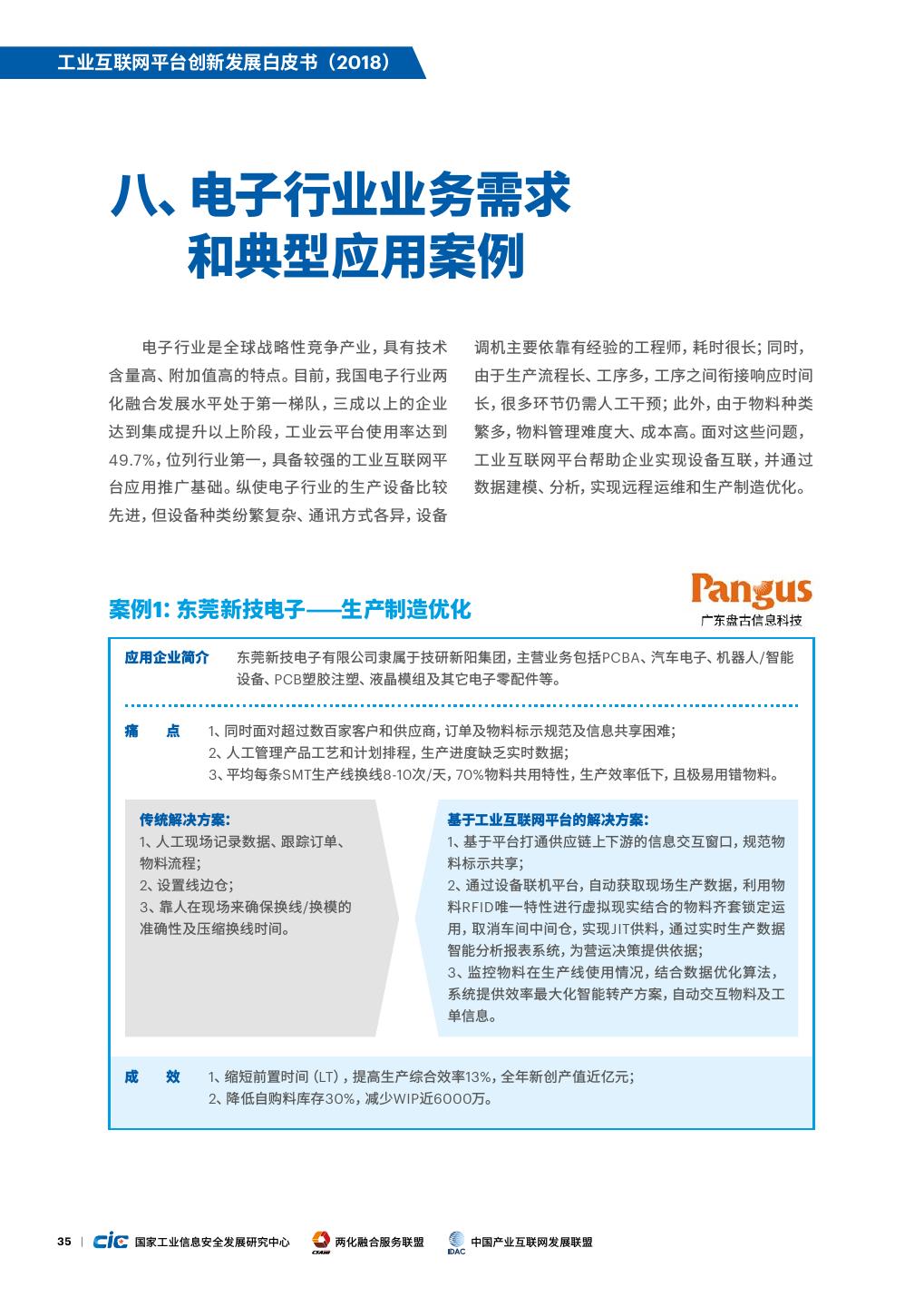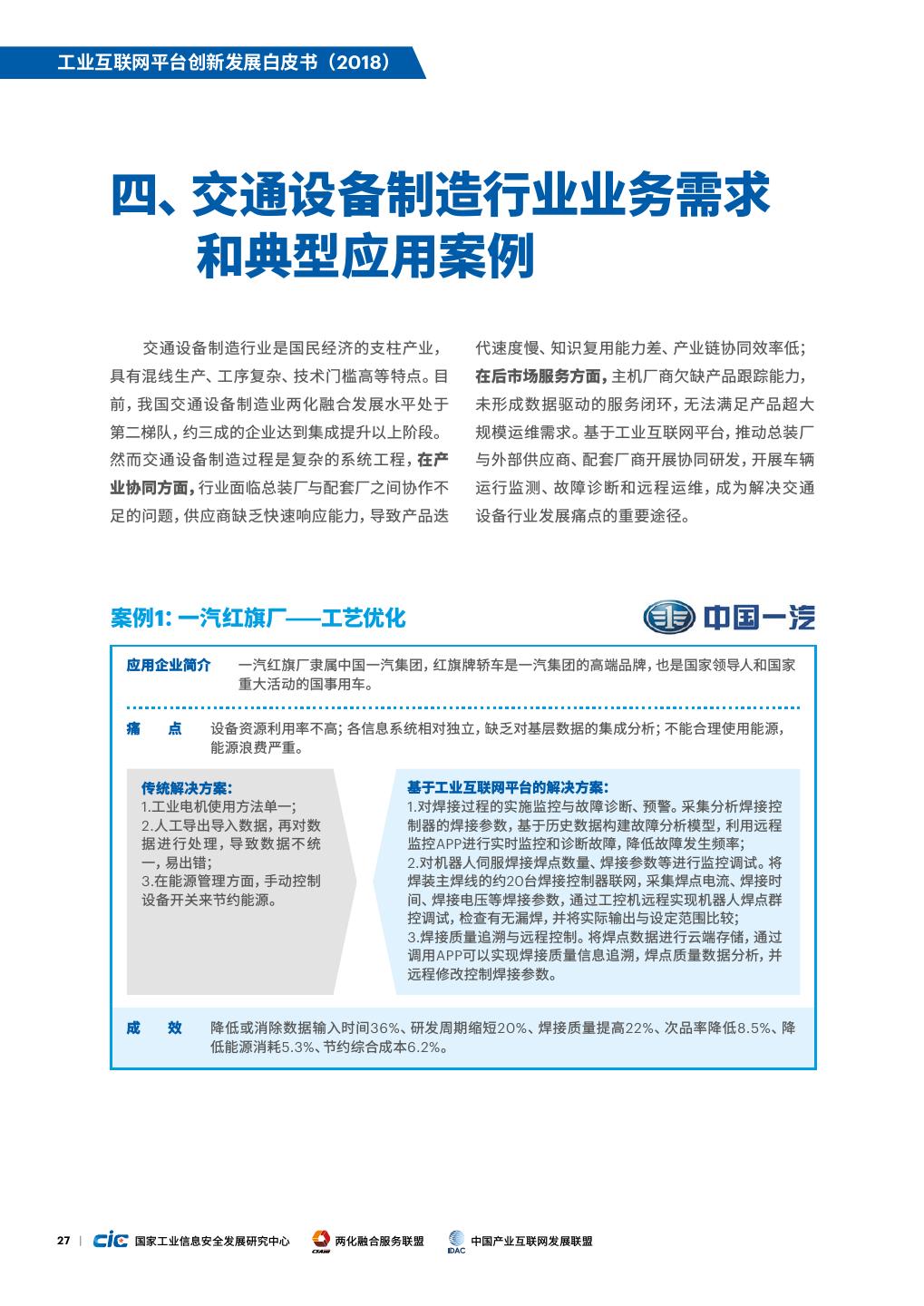 22 .工业互联网平台创新发展白皮书(2018) 图8. 我国工业互联网平台应用案例行业分布 33% 14% 14% 13% 9% 8% 5% 5% 机械 电子 交通设备 电力 钢铁 服装 石化 家电 制造 1.两化融合水平较高的行业引领平台创新应用 务;另一方面,基于对用户使用数据的分析与价值 挖掘,围绕高价值设备提供租赁、保险、贷款等创 从发展基础看,电力、电子和家电等两化融合 新服务,推动形成社会化协作与跨界融合。例如, 水平较高的行业,由于制造技术、信息技术、管理 徐工信息基于Xrea工业互联网平台为新能源汽车 技术和知识积累较为成熟,升级改造难度小,更具 主机厂提供车辆远程监测与数据分析服务,减少了 应用工业互联网平台能力优势和成本优势。从发 80%由于客户使用而造成的车辆质量事故,减少了 展需求来看,两化融合水平较高行业正在向网络化 40%车辆出现故障后返厂维修的情况,有效提高 发展阶段迈进,能更有效地利用工业互联网平台 客户满意度。 提供的新技术、新解决方案,创新应用模式,开辟 发展新空间。例如,国网青海电力联合昆仑数据和 3.流程行业率先布局基于平台的安全环保综合管 金风科技等企业共同打造新能源行业工业互联网 控能力建设 平台,接入省内外29个发电场站,以新能源发电侧 为切入口,对接入新能源电站集中智能监控、生产 一是钢铁、石化、采掘等行业具有高耗能、高 运行管理、业务智能分析及设备故障预警等服务, 排放、高危险、工艺复杂等特点,安全问题、环保问 解决跨企业、跨区域的新能源并网消纳等问题,构 题成为制约行业发展的主要瓶颈,工业互联网平 建能源互联网应用生态。 台结合大数据、人工智能等新技术手段,为这些行 业提供了新型的能源管控、安全管控解决方案,提 2.同业竞争越激烈的行业向“产品+服务”转型的 升行业内企业整体精细化管控水平。例如,优也为 步伐越快 东部某钢铁企业开发了高炉煤气智能平衡系统,实 现煤气智能联调运行,每年可减少高炉煤气排放总 我国工业处于转型升级关键时期,以交通设 量的3%放散,节约能源约1700万元。二是在消费 备制造、机械等为代表的行业面临结构调整、需求 者广泛关注的食品和药品领域,产品质量安全问题 放缓、同质化竞争激烈等方面的巨大压力。提供产 是行业面临的首要痛点,基于平台开展产品全流程 品+服务等增值服务,开展服务化转型,是企业获 质量管理成为应用重点。伊利集团基于自建的工业 取更大价值空间、提升可持续竞争优势的有效方 互联网平台开展产品全生命周期管理,实现奶粉从 式。以设备制造行业为例,一方面基于设备运营数 原辅料入库到消费者的全过程追溯,产品追溯查 据,对设备资产进行在线实时监控、故障分析、预 询速度达到秒级。 测性维护、远程 运 维等管理,提供多样化 增值 服 15 | 国家工业信息安全发展研究中心 两化融合服务联盟 中国产业互联网发展联盟